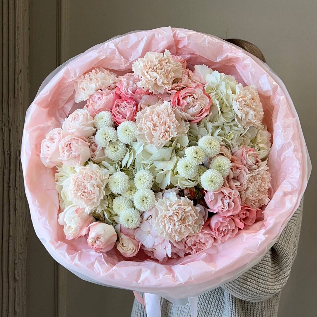 Этот букет — словно воздушное облако из зефира и взбитых сливок, воплощающее невероятную нежность. Объемные, пышные шапки гортензий создают роскошную фактурную основу, в которой утопают кружевные лепестки диантусов. Особый шарм и романтику композиции придают изысканные кустовые и пионовидные розы с их утонченными бутонами. Пастельная палитра, объединяющая кремовые, белые и пудрово-розовые оттенки, дарит ощущение легкости, безмятежности и теплоты. Оформление в мягкую розовую бумагу идеально завершает этот сладкий и мечтательный образ.