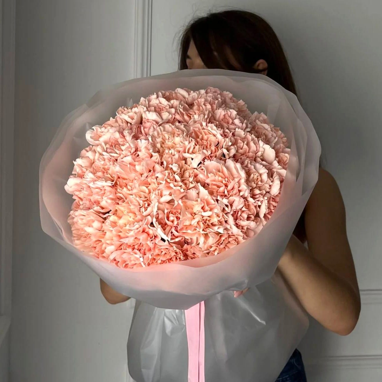 Этот букет — это нежный румянец зари, собранный в пышное, воздушное облако. Я создала его из тридцати семи диантусов теплого, персиково-розового оттенка, чтобы передать ощущение уюта и искренней симпатии. Каждый цветок с его кружевными лепестками — это нотка нежности, которые вместе сливаются в единую, гармоничную мелодию.