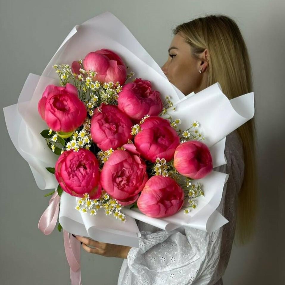 Букет состоящий из 9 пионов и танацетума в нашей стильной фирменной упаковке.
