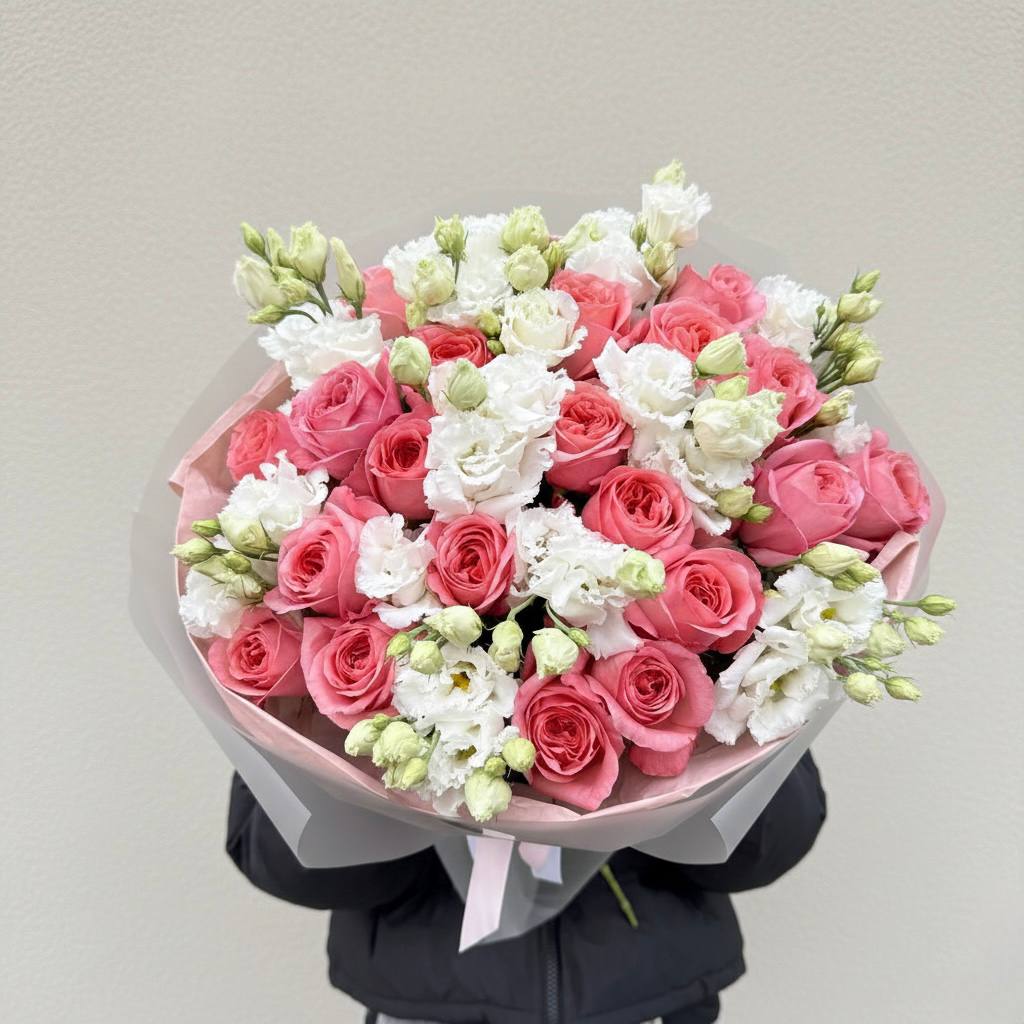 Изысканное сочетание классической нежности и современной флористики. Пышные бутоны розовых пионовидных роз гармонично соседствуют с воздушными цветами белой эустомы, создавая многослойную и глубокую композицию. Контрастная матовая упаковка выгодно подчеркивает пастельные тона букета, делая его идеальным подарком для самых утонченных натур.
