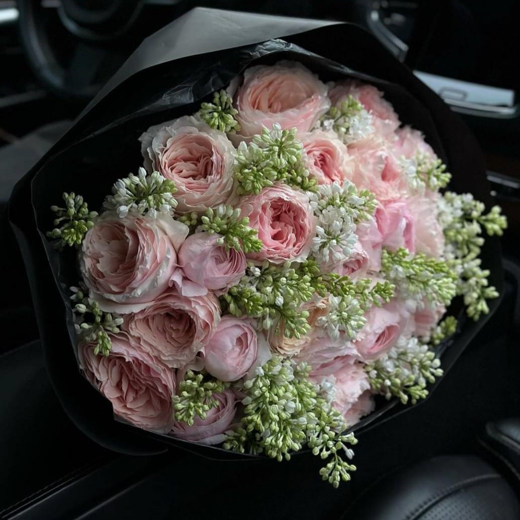 Состав: Ранункулюс - 10 шт., Сирень - 9 шт., Пионовидная роза - 12 шт.