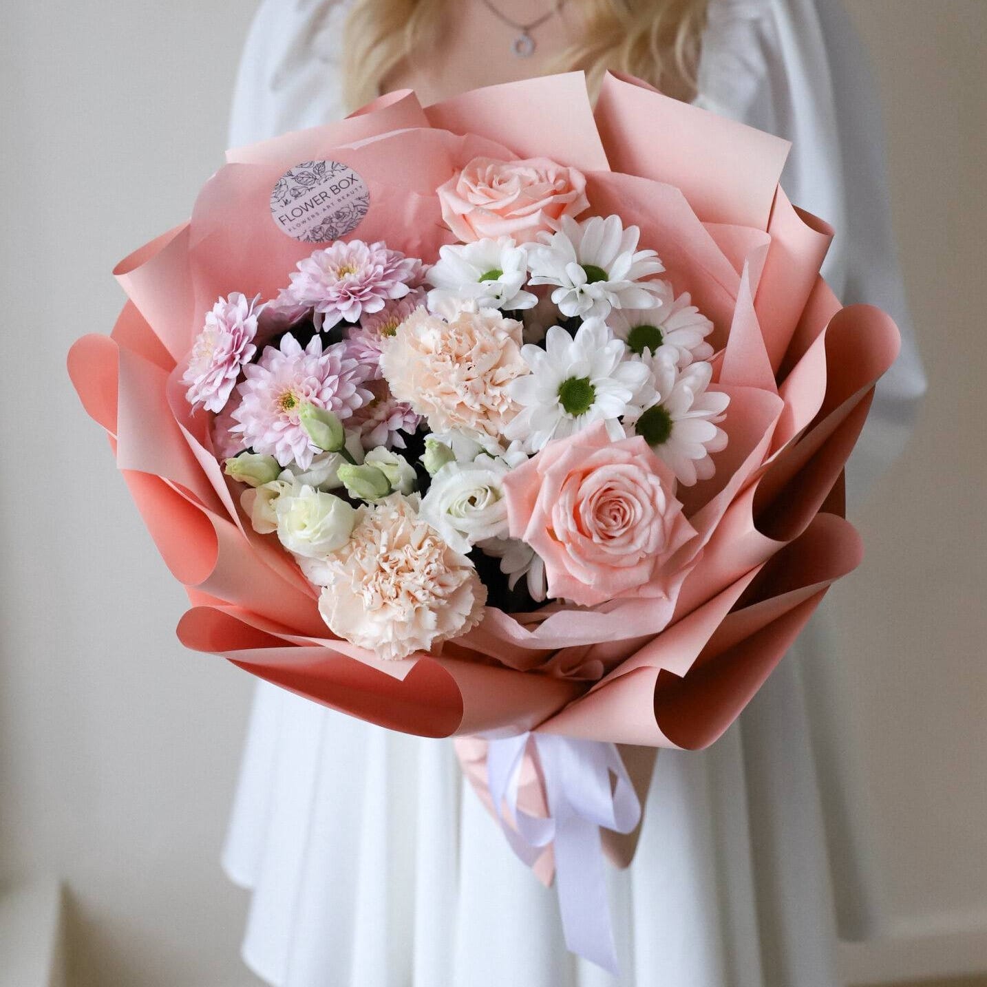 Этот букет — это искренняя детская благодарность, выраженная на языке нежных цветов. Я собрала в нем самые очаровательные цветы в теплой, персиково-розовой гамме: классические розы, пышные хризантемы, кружевные диантусы и трепетную эустому. Получился компактный, но очень нарядный букет, который удобно держать в руках и приятно дарить.