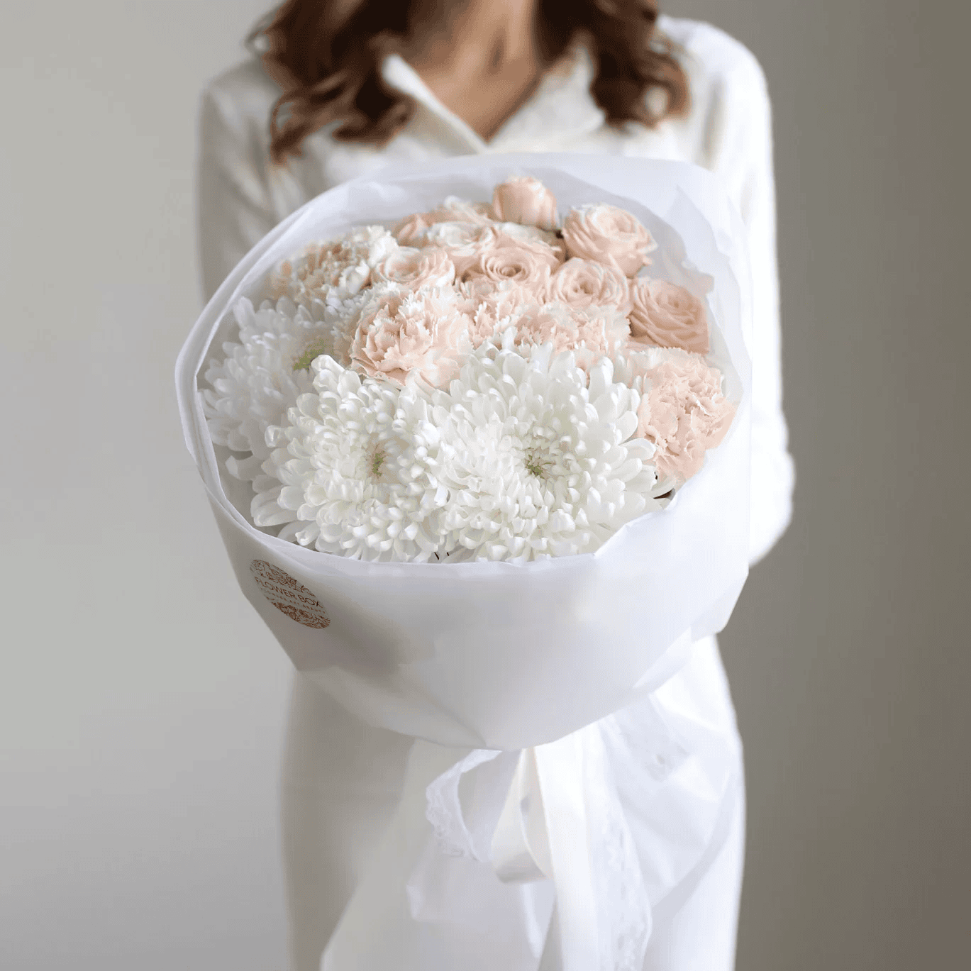 Состав: одноголовые хризантемы 3 шт., диантус 5 шт., кустовые пионовидные розы 2 шт.