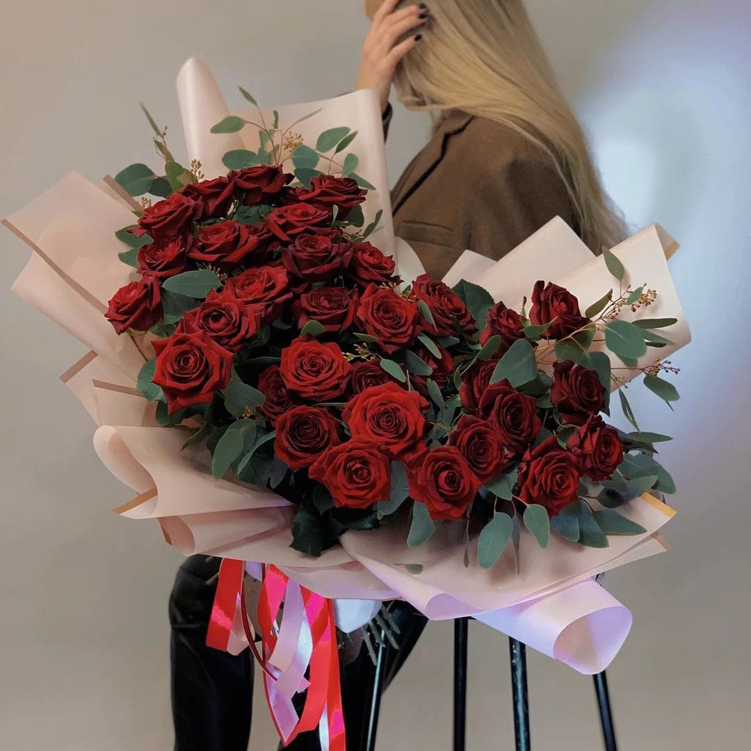 Большой букет из роз с эвкалиптом «RED Art»