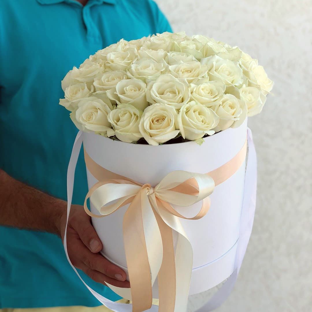 35 белых роз в белой коробке