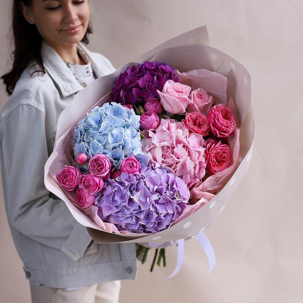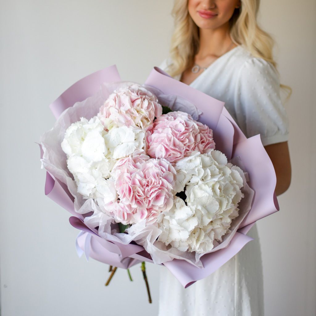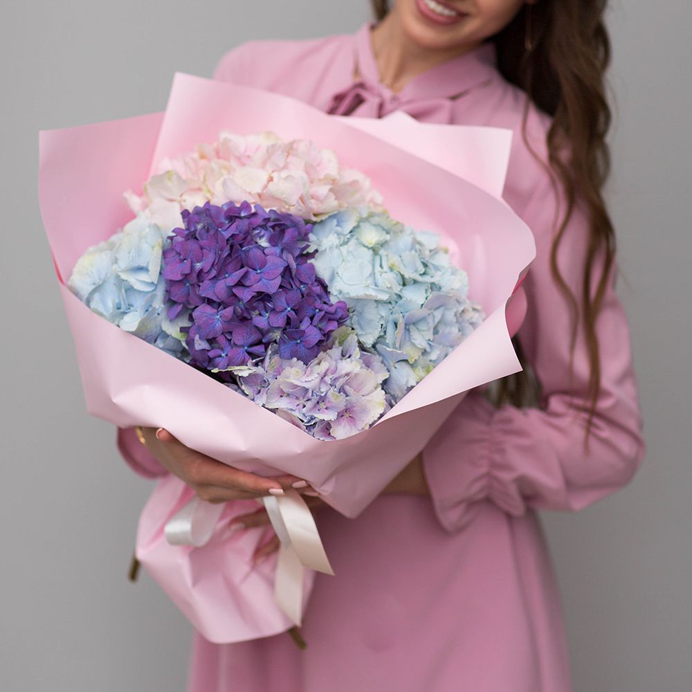 Букет из пяти гортензий микс в оформлении