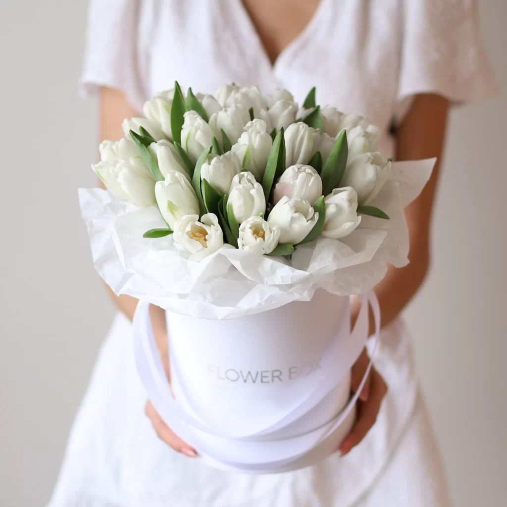 Белые тюльпаны в шляпной коробке (S)