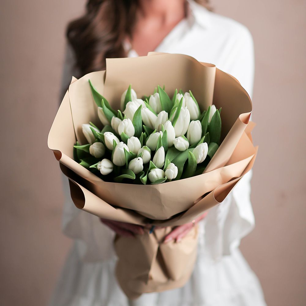 Букет из 31 белого тюльпана в оформлении