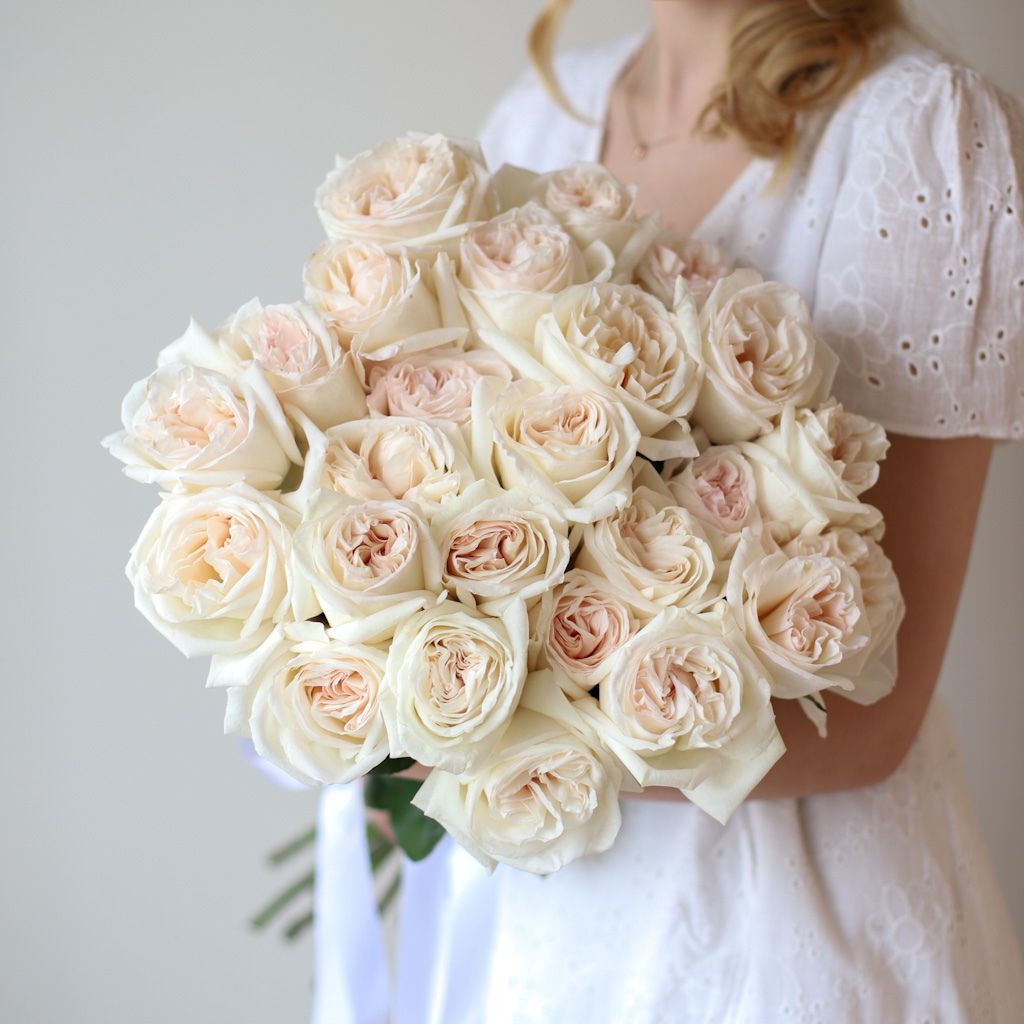Монобукет из 25 пионовидных роз White O`hara в ленту