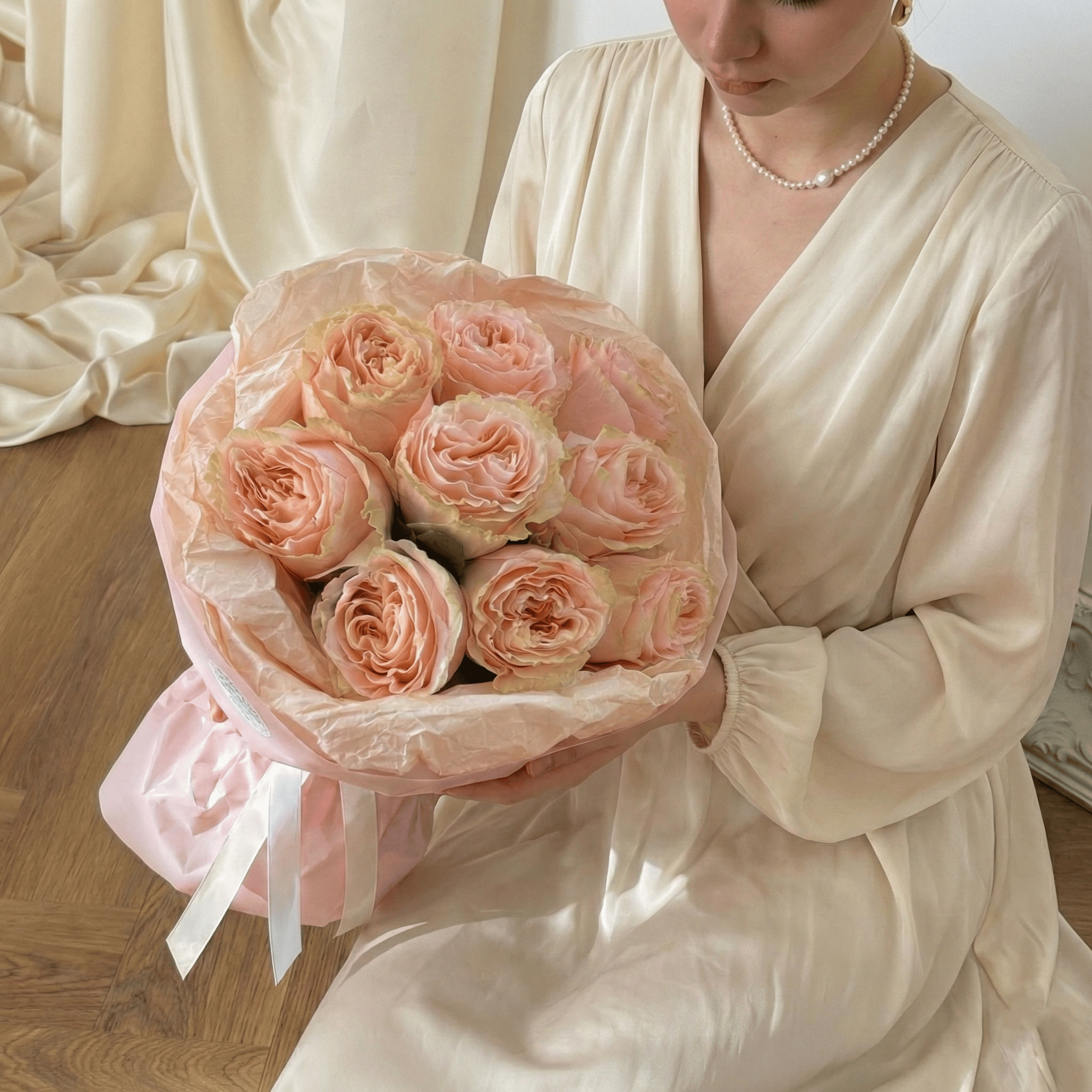 This monobouquet is a hymn to femininity and royal dignity. The "Princess Crown" variety is distinguished by the unique shape of its bud: dense, layered petals open into a lush cup with vintage charm. Their shade captivates with a smooth transition from a porcelain-cream edge to a delicate peach center. The concise packaging in powder-pink tones with a satin ribbon does not distract, but rather emphasizes the nobility and status of these rare flowers. The ideal choice for a declaration of love or a sign of special attention.