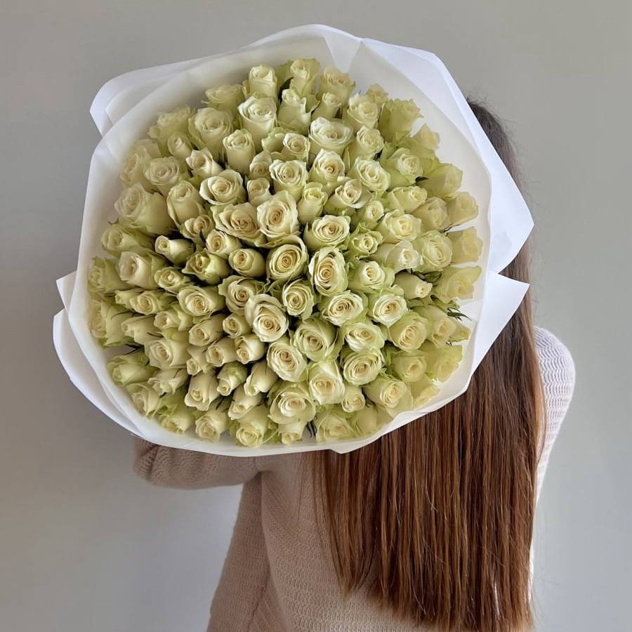 This bouquet is a true floral masterpiece, capable of capturing any heart with its scale and impeccable beauty. 101 snow-white Kenyan roses are gathered into a dense, heavy armful, resembling a snow avalanche. Despite the petite size of the Kenyan rose buds, in such an impressive quantity, they create incredible volume and a velvety texture. The white color symbolizes absolute purity, sincerity, and infinite love. Wrapped in light paper, the packaging gives the composition a finished look without distracting from the main feature—the luxurious number of flowers. This is a gift for the most important moments when words are unnecessary.
