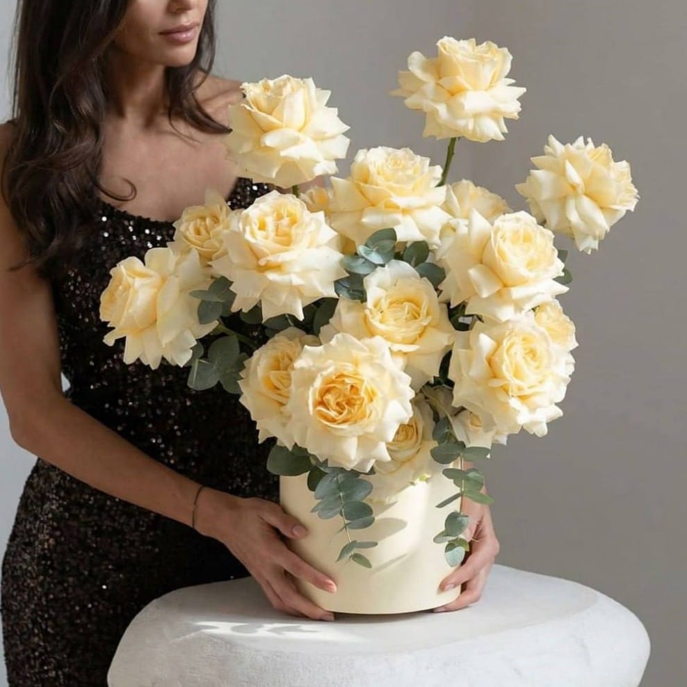 Потрясающая композиция из 21 французской розы теплого сливочного оттенка. Благодаря специальной технике раскрытия лепестков («вывернутые» розы), букет выглядит невероятно пышным и объемным, напоминая воздушное кремовое облако. Веточки эвкалипта добавляют свежести и создают стильный контраст с нежными бутонами. Элегантная шляпная коробка завершает образ, делая подарок готовым украшением интерьера без необходимости искать вазу.