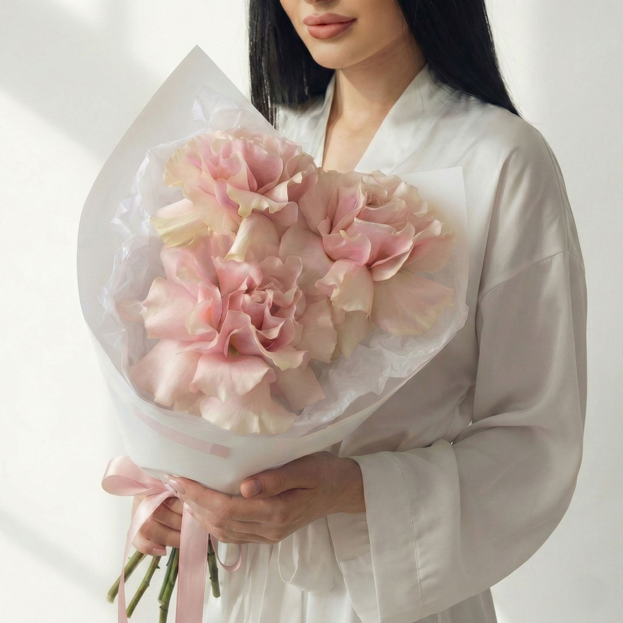 Этот букет — воплощение современной флористической моды и утонченного вкуса. Всего три французские розы создают потрясающий визуальный эффект благодаря особой технике раскрытия бутона. Вывернутые наружу лепестки придают цветам невероятный объем, воздушность и кружевную текстуру, превращая каждый стебель в настоящее произведение искусства. Нежно-розовый оттенок подчеркивает романтичность подарка, а лаконичная упаковка не отвлекает внимание от природной красоты цветов. Это идеальный выбор для стильного сюрприза, который говорит о безупречном вкусе дарителя.