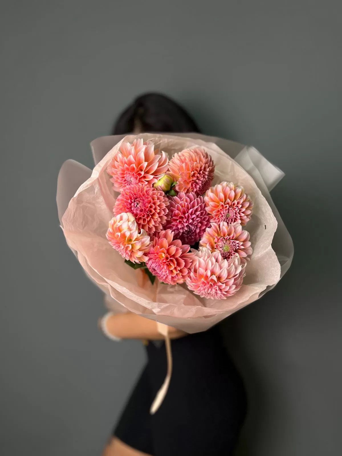 Букет из 9 персиковых георгин «Carnaval»