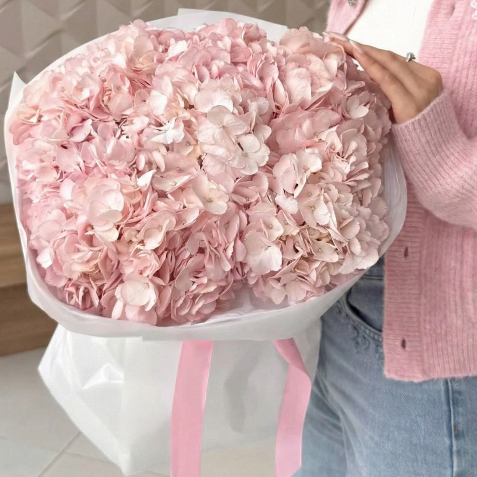 Настоящий флористический шедевр, поражающий своими масштабами. Монобукет из 9 отборных розовых гортензий образует гигантское, невероятно нежное облако, которое способно заполнить собой всё пространство и создать атмосферу абсолютного восторга. Каждое соцветие — это сложная мозаика из сотен лепестков, а вместе они превращаются в роскошный подарок, подчеркивающий исключительность момента. Безупречный выбор для самого важного события или грандиозного жеста.