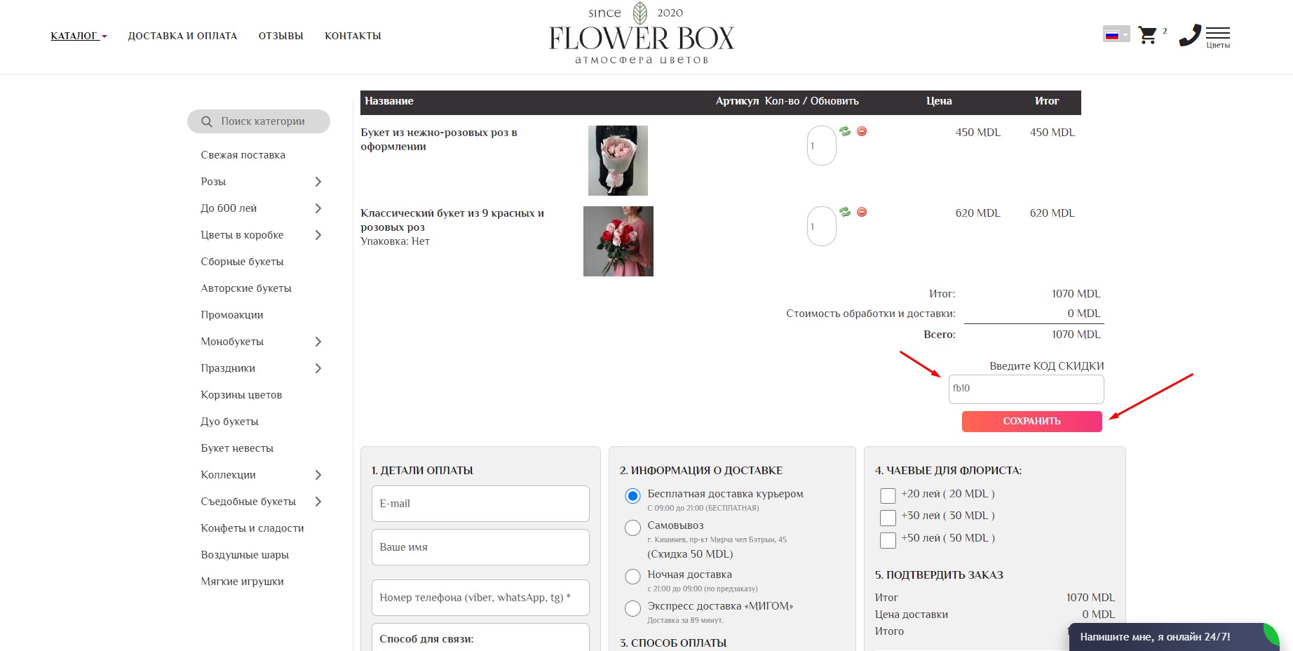 Добавьте любой букет в корзину от 1000 лей. В поле "КОД СКИДКИ" введите fb10 и сохраните. К вашему заказу применится скидка в размере 10%.