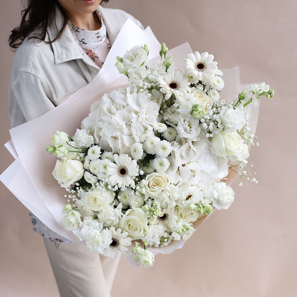 Состав: Гортензия - 2 шт., Гермини нежная - 5 шт., Эустома - 4 шт., Гипсофила - 3 шт., Роза одноголовая белая - 7 шт., Диантус - 7 шт., Хризантема коконат (либо ромашковая/кустовая) - 3 шт.