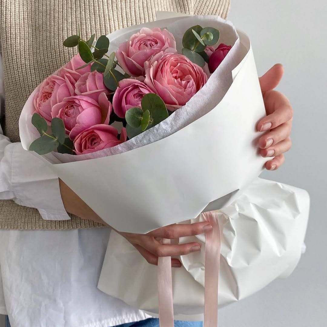 Состав: Кустовая пионовидная роза Сильва Пинк (Премиум) - 3 шт., Эвкалипт.