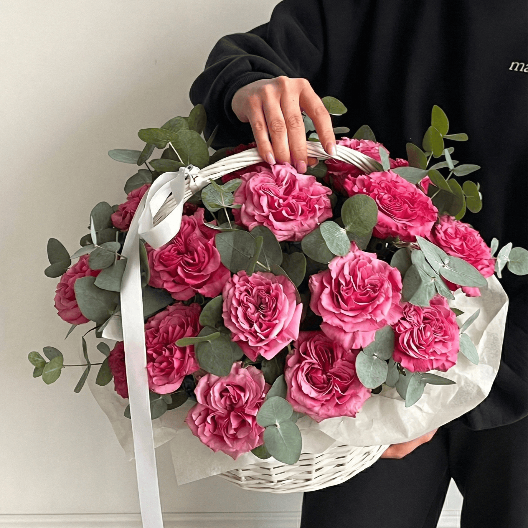 Роскошная садовая классика в современном исполнении. 21 премиальная пионовидная роза с их густыми, многослойными бутонами идеально сочетается с благородной зеленью эвкалипта. Пряный аромат хвои подчеркивает тонкое благоухание роз, а изящная белая корзина придает композиции статусность и завершенность. Этот подарок создан для того, чтобы произвести неизгладимое впечатление и стать главным украшением любого торжества.
