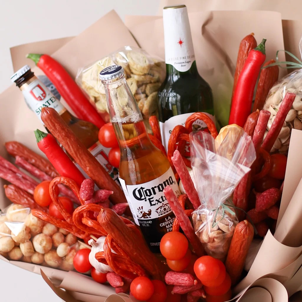 Состав: Колбаски кабанос, колбаски баварские, колбаски салями, фисташки, сухарики, ниточный сыр, арахис, помидоры Черри, горький перец, чеснок.
