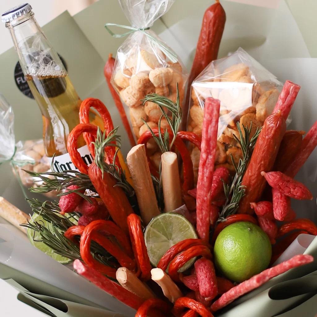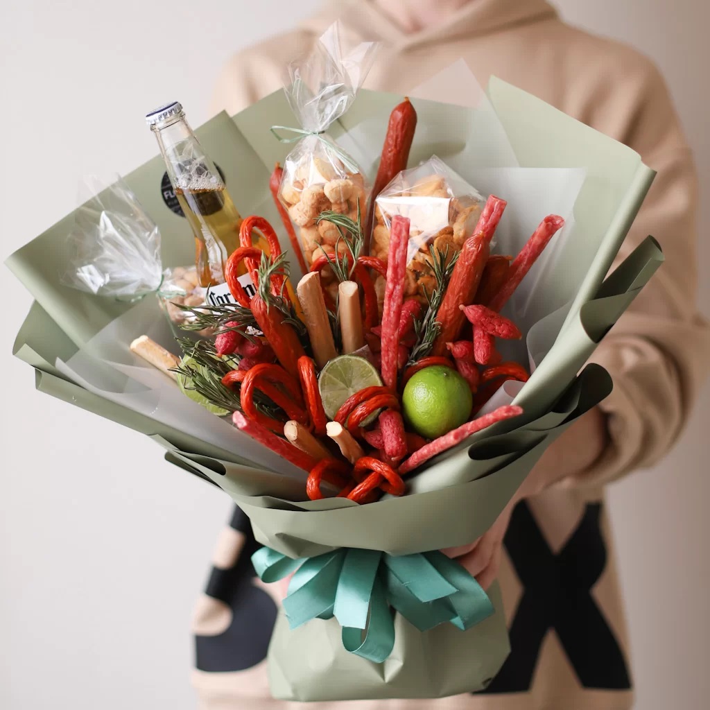 Состав: Ниточный сыр, лайм, колбаски кабанос, колбаски баварские, колбаски салями, арахис, сухарики, фисташки, розмарин.