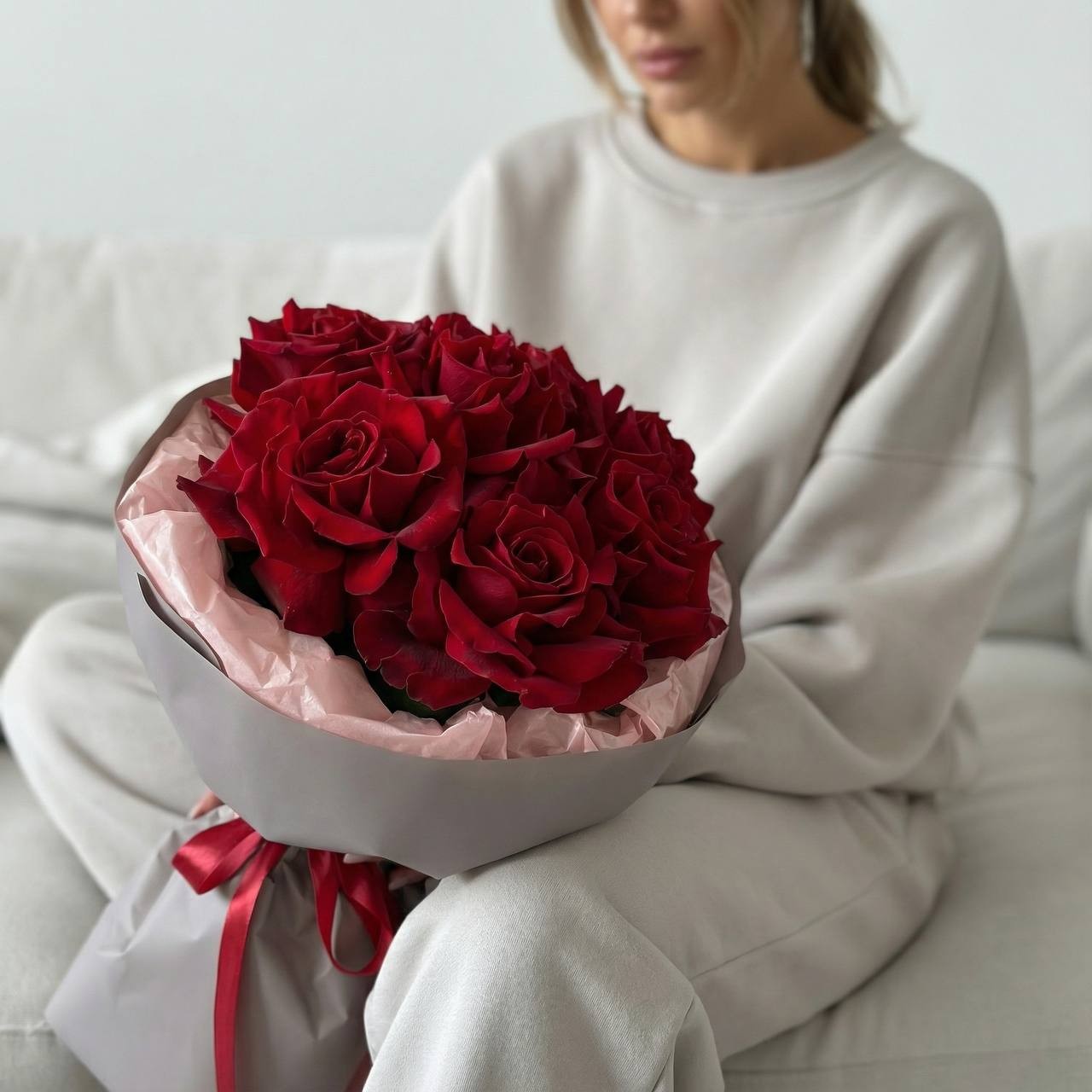Этот букет - воплощение элегантности и пылких чувств. Я использовала 7 великолепных красных роз, оформленных в модной технике «французская роза» - с вручную вывернутыми лепестками. Это придает бутонам невероятный объем, пышность и фактурность, делая их похожими на диковинные цветы из сада. Глубокий алый цвет в сочетании со стильной серой упаковкой и красной лентой смотрится благородно и дорого.