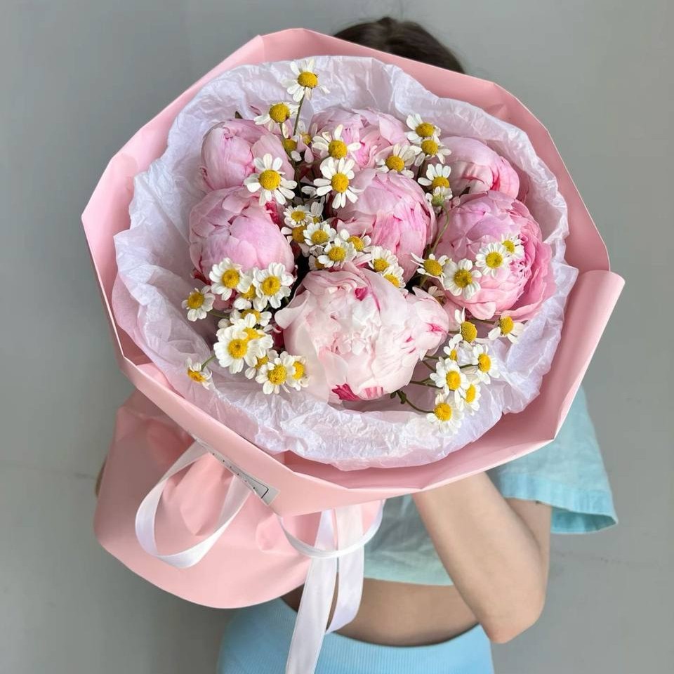 Нежный и по-летнему беззаботный букет, в котором пышные розовые пионы встречаются с очаровательным танацетумом. Сочетание крупных, многослойных бутонов и мелких «ромашек» создает образ цветущего сада и дарит ощущение легкости. Розовая матовая упаковка подчеркивает мягкость оттенков, делая этот букет идеальным выбором для романтического свидания или теплого поздравления близкого человека.