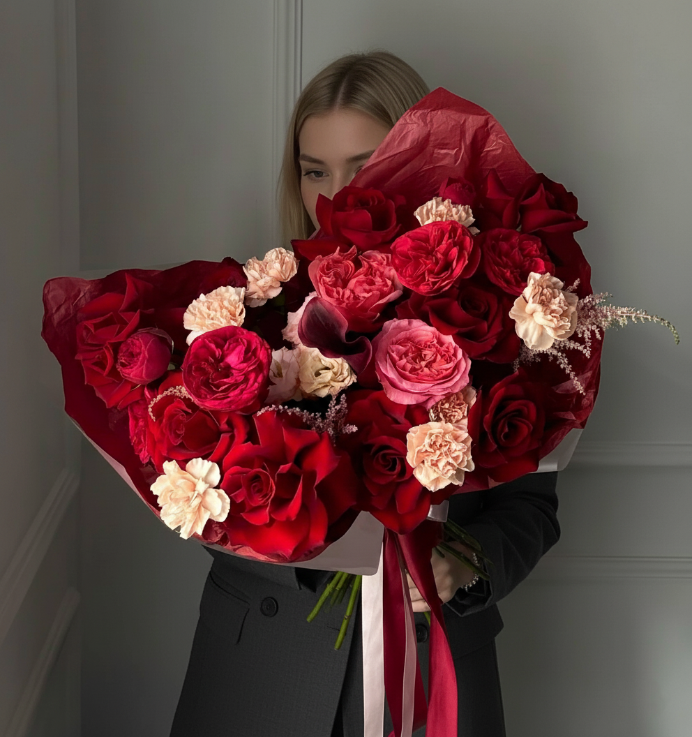 Acest buchet este o adevărată întruchipare a luxului și a frumuseții multifacetice. Am adunat în el cele mai rafinate flori într-o gamă complexă de culori pudrate și de vin. Trandafirii francezi nobili și eustomele delicate creează o bază elegantă. Un accent vibrant este adus de trandafirii 'Red Piano' și dianthus, adăugând profunzime și pasiune. Iar secretul principal al aerisirii și lejerității acestei compoziții îl reprezintă paniculele pufoase de astilbe, care îi conferă un farmec unic, de vis. Comandați flori online Chisinau pentru un cadou de neuitat.