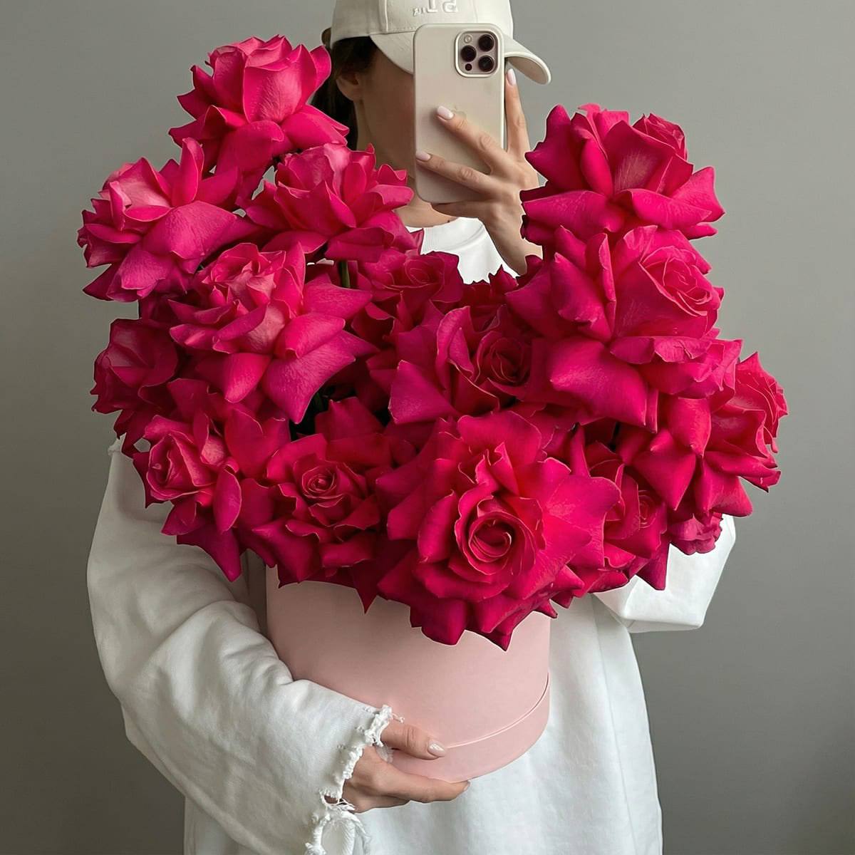 Acest buchet este întruchiparea eleganței și a pasiunii. 23 de trandafiri francezi, cu deschiderea lor unică și petalele răsfrânte, creează un nor volumetric și texturat de o culoare magenta intensă. Forma rafinată a fiecărei flori atrage privirile, iar cutia de pălărie de un roz pal evidențiază delicatețea petalelor, adăugând o notă romantică aranjamentului. Alegerea ideală pentru a exprima sentimente profunde cu mult gust.
