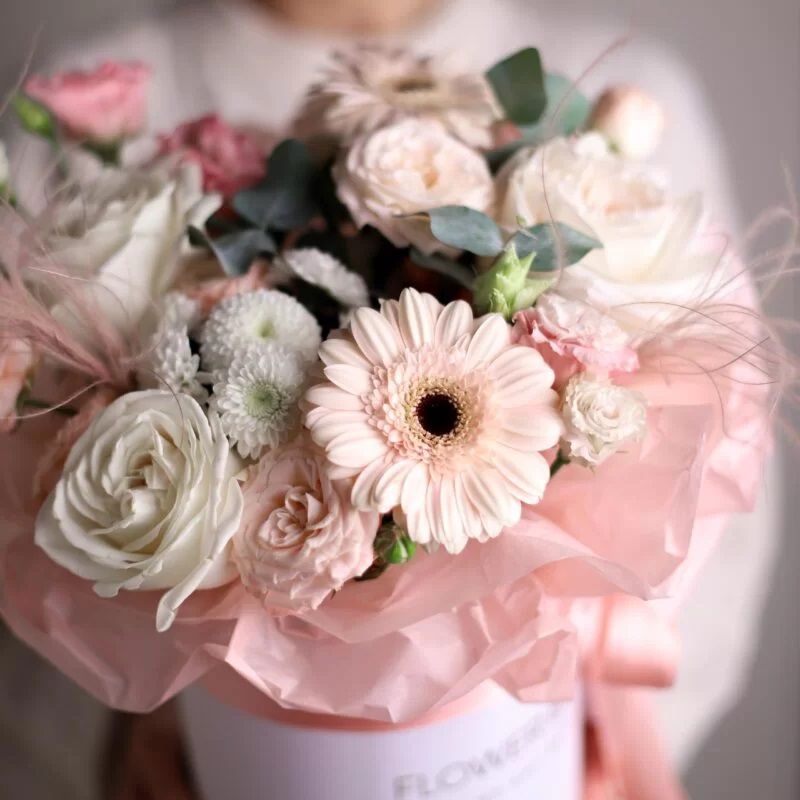 Цветочный нежный микс в шляпной коробке