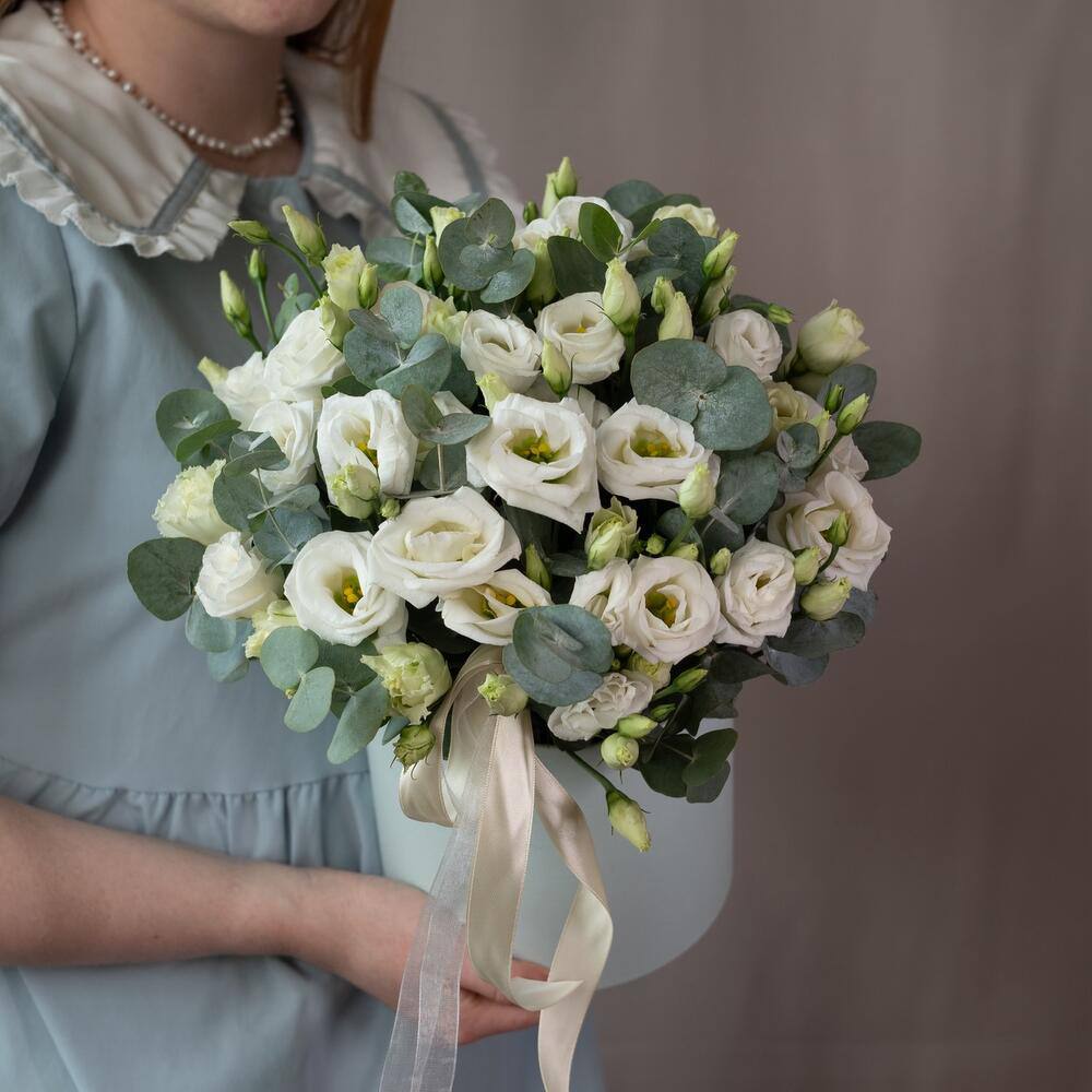 Пышное цветочное облако в элегантном оформлении. 9 веток белоснежной эустомы создают потрясающий объем благодаря множеству раскрытых бутонов, напоминающих трепетные миниатюрные розы. Благородный серебристый эвкалипт добавляет композиции свежести и легкого аромата. Светлая шляпная коробка с изящными струящимися лентами делает этот подарок завершенным и невероятно стильным. Цветы находятся в специальной флористической губке, поэтому композиция не требует вазы и будет долго радовать своей первозданной свежестью.
