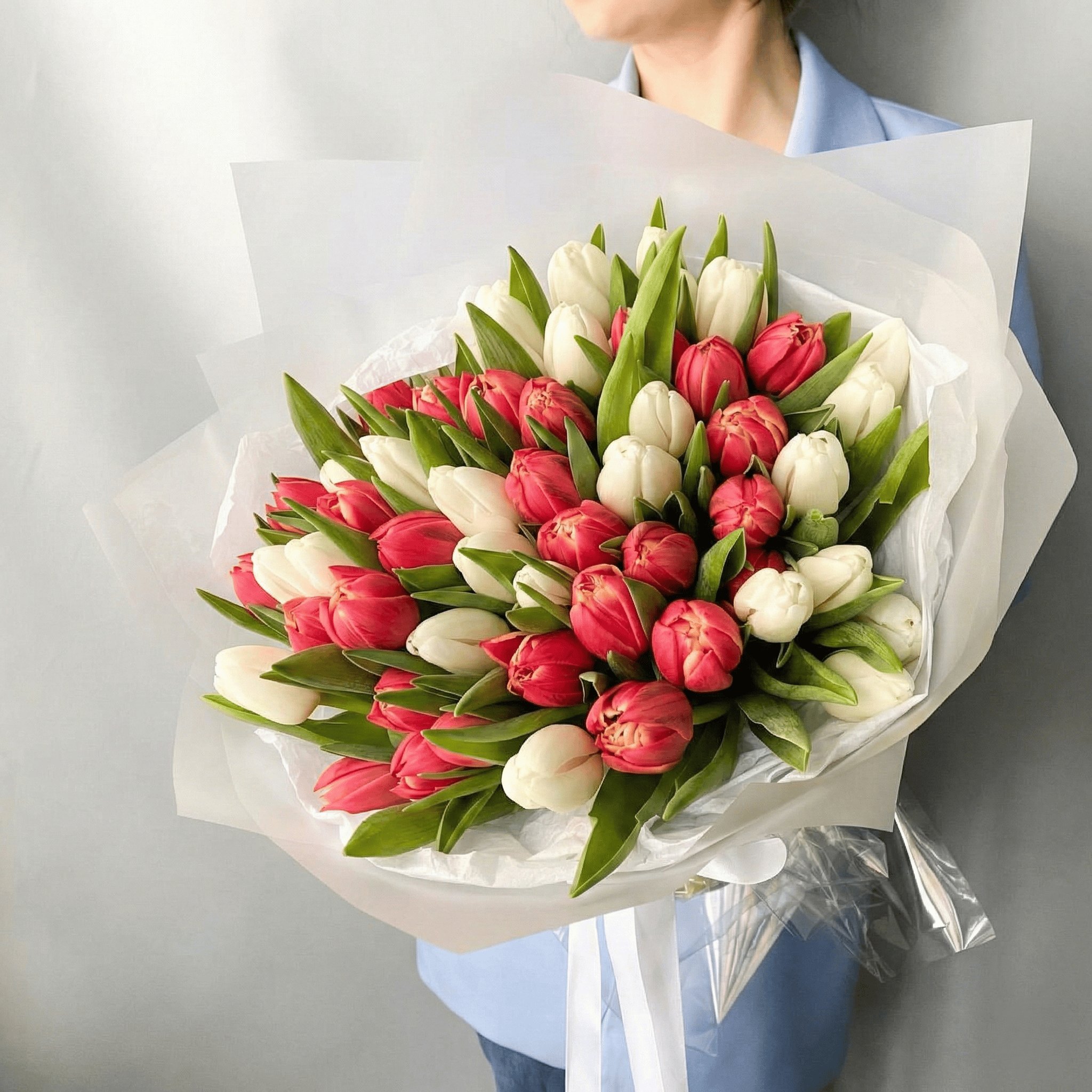 Contrastul vibrant și plin de viață între lalelele albe ca zăpada și cele de un roșu intens creează o atmosferă de sărbătoare și de trezire a naturii. Compoziția densă din 51 de flori arată bogată și impunătoare, în timp ce ambalajul deschis minimalist subliniază prospețimea fiecărei petale. Acest buchet va fi cadoul ideal pentru a exprima sentimente sincere și pentru a oferi o stare de spirit însorită.