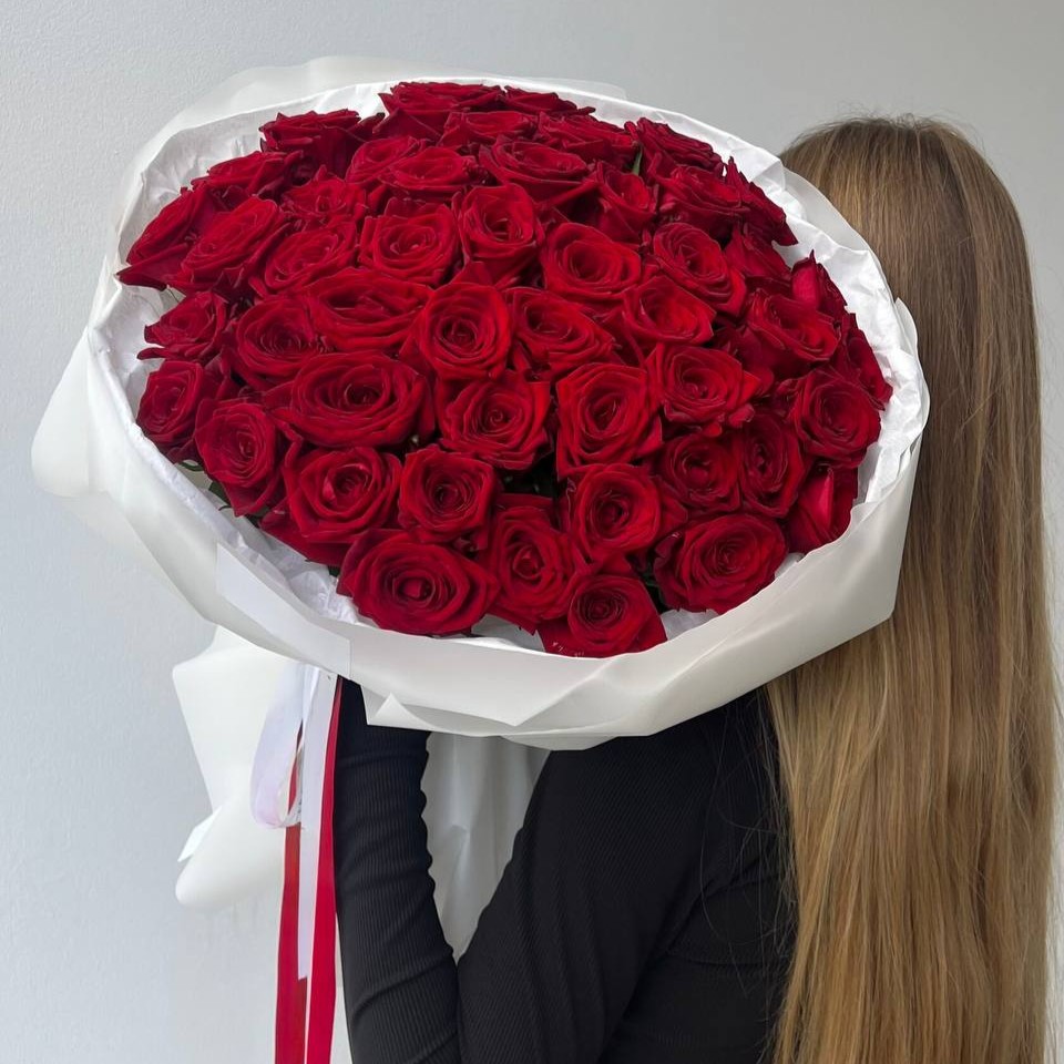 Классический символ глубокой страсти и восхищения в безупречном исполнении. Пятьдесят одна отборная голландская роза с крупными бутонами и высокими стеблями образует плотное, бархатистое облако алого цвета. Лаконичное оформление в белых тонах создает эффектный контраст, подчеркивая элитное качество каждого цветка.