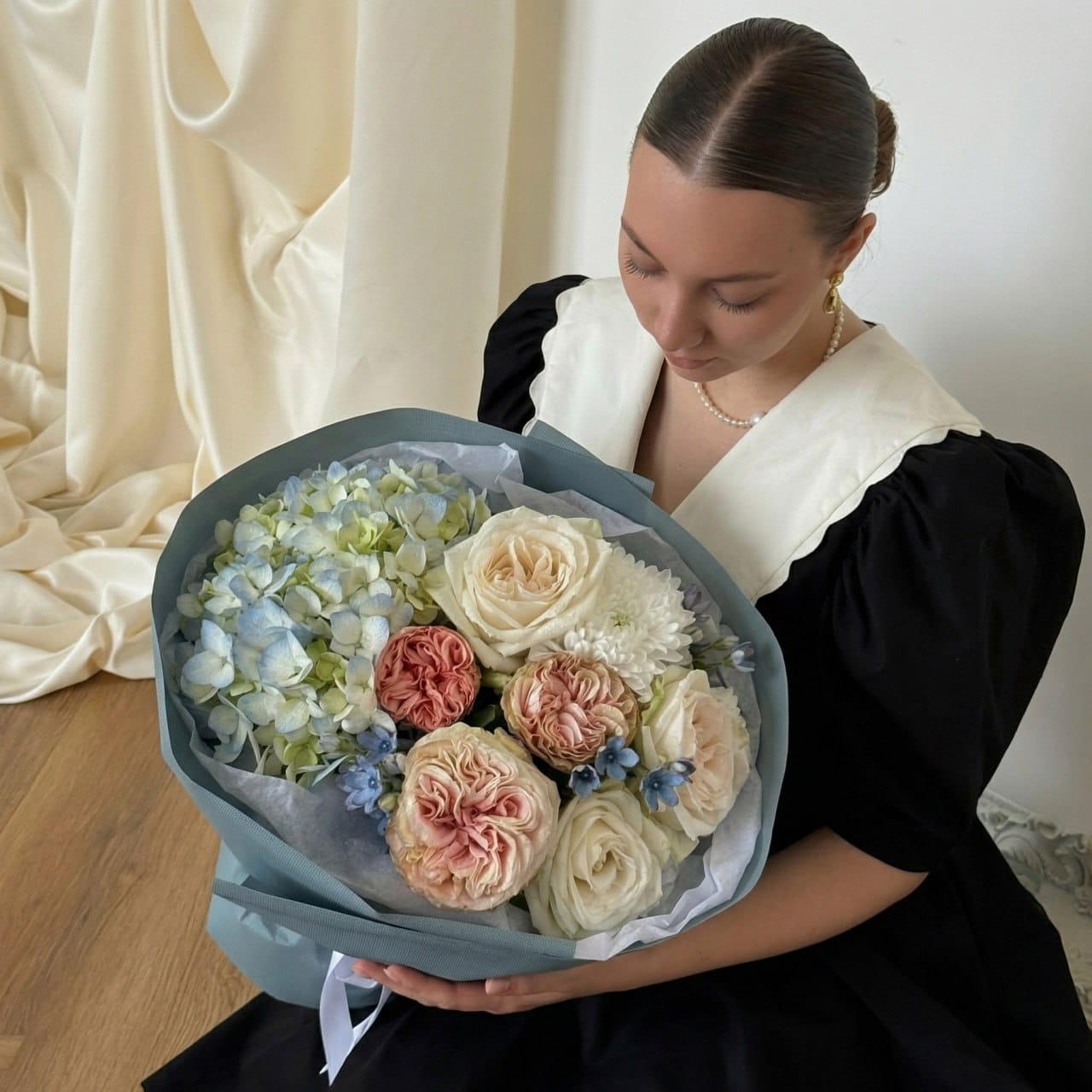 Воздушная и романтичная композиция, напоминающая о небесной чистоте и утренней свежести. Пышная голубая гортензия в центре задает спокойный тон, а небесно-голубые звездочки оксипеталума добавляют букету игривости и уникальности. Кремовые и персиковые пионовидные розы привносят в ансамбль теплоту и изысканность, создавая мягкий контраст с прохладными оттенками. Одиночная крупная хризантема завершает образ своей фактурной красотой. Букет оформлен в стильную голубую упаковку, идеально дополняющую цветовую гамму.