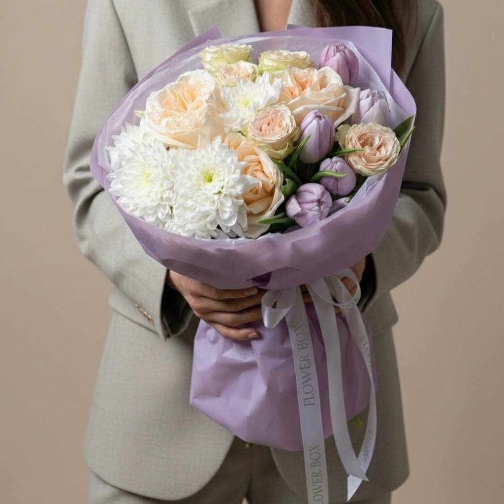 Этот букет — само воплощение нежности и дыхания весны. Объемная, пушистая белоснежная кустовая хризантема служит мягким облаком, на котором уютно расположились изысканные пионовидные и кустовые розы кремово-персиковых оттенков. Особую свежесть и элегантный акцент композиции придают сиреневые тюльпаны. Оформление в светло-сиреневую матовую бумагу с фирменной лентой идеально подчеркивает пастельную палитру, делая букет воздушным, романтичным и очень трогательным подарком.