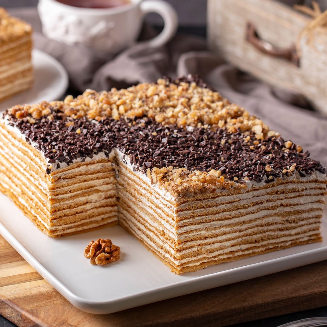 Медовый бисквит со взбитыми сливками и сердцевиной грецкого ореха.