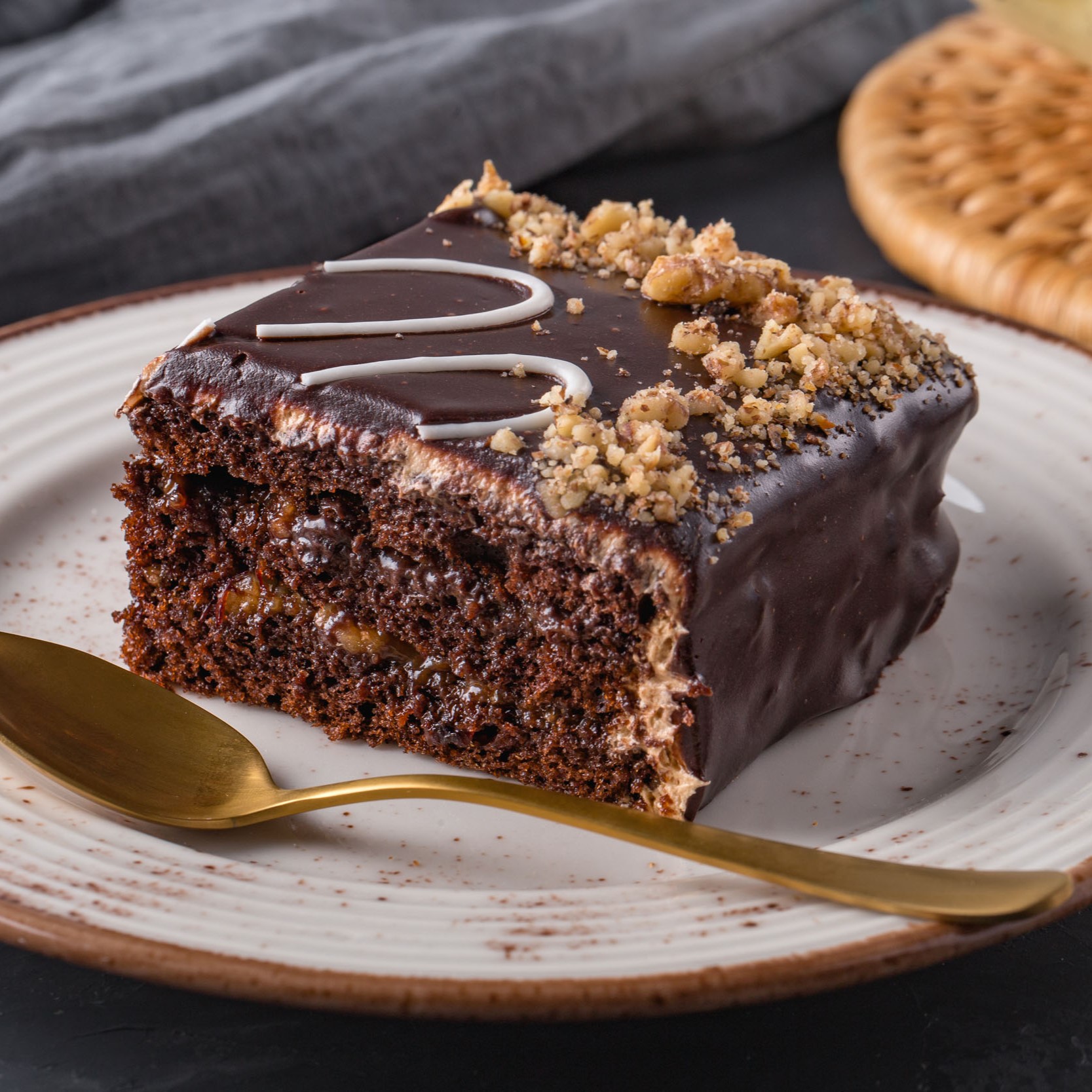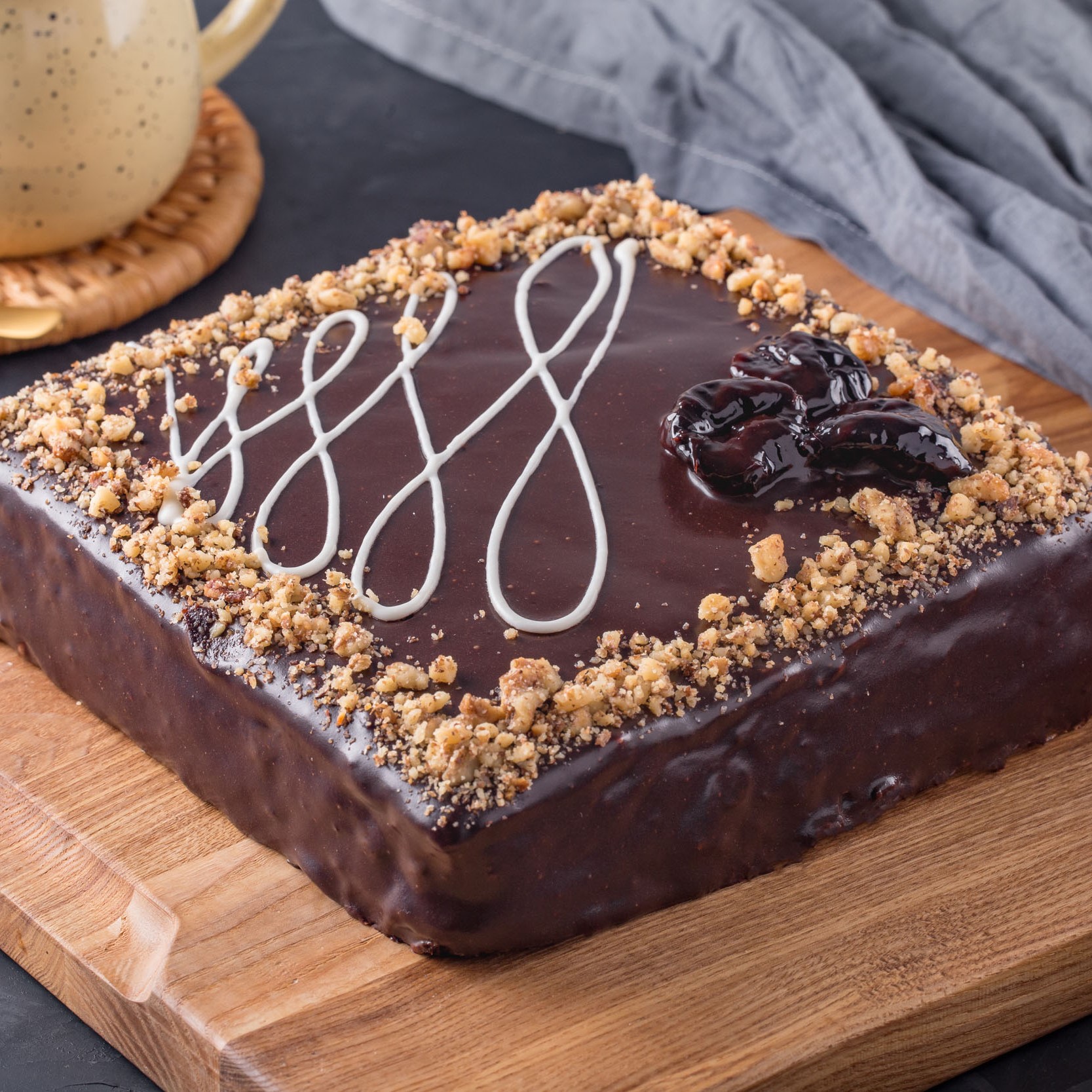 Шоколадный бисквит, крем из вареной сгущенки, с орехово-сливовой начинкой.