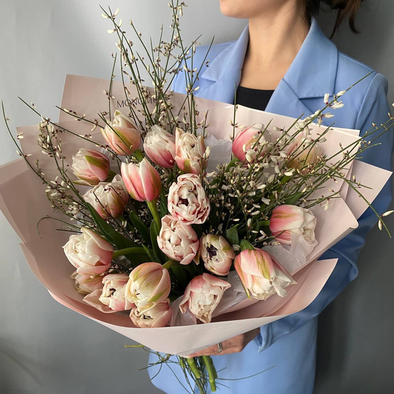 Настоящее дыхание весны в одном букете. Сочетание 19 нежных пионовидных тюльпанов с их многослойными бутонами и воздушных веток дженисты создает образ цветущего сада. Мелкие белые соцветия дженисты добавляют композиции легкости и динамики, делая её живой и фактурной. Этот букет в пастельных тонах станет идеальным подарком, чтобы подарить весеннее настроение и выразить самые искренние чувства.