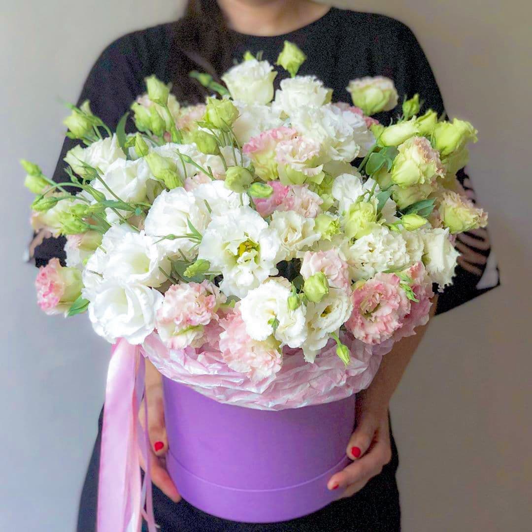 Эустомы в шляпной коробке - 15 шт. (большая)