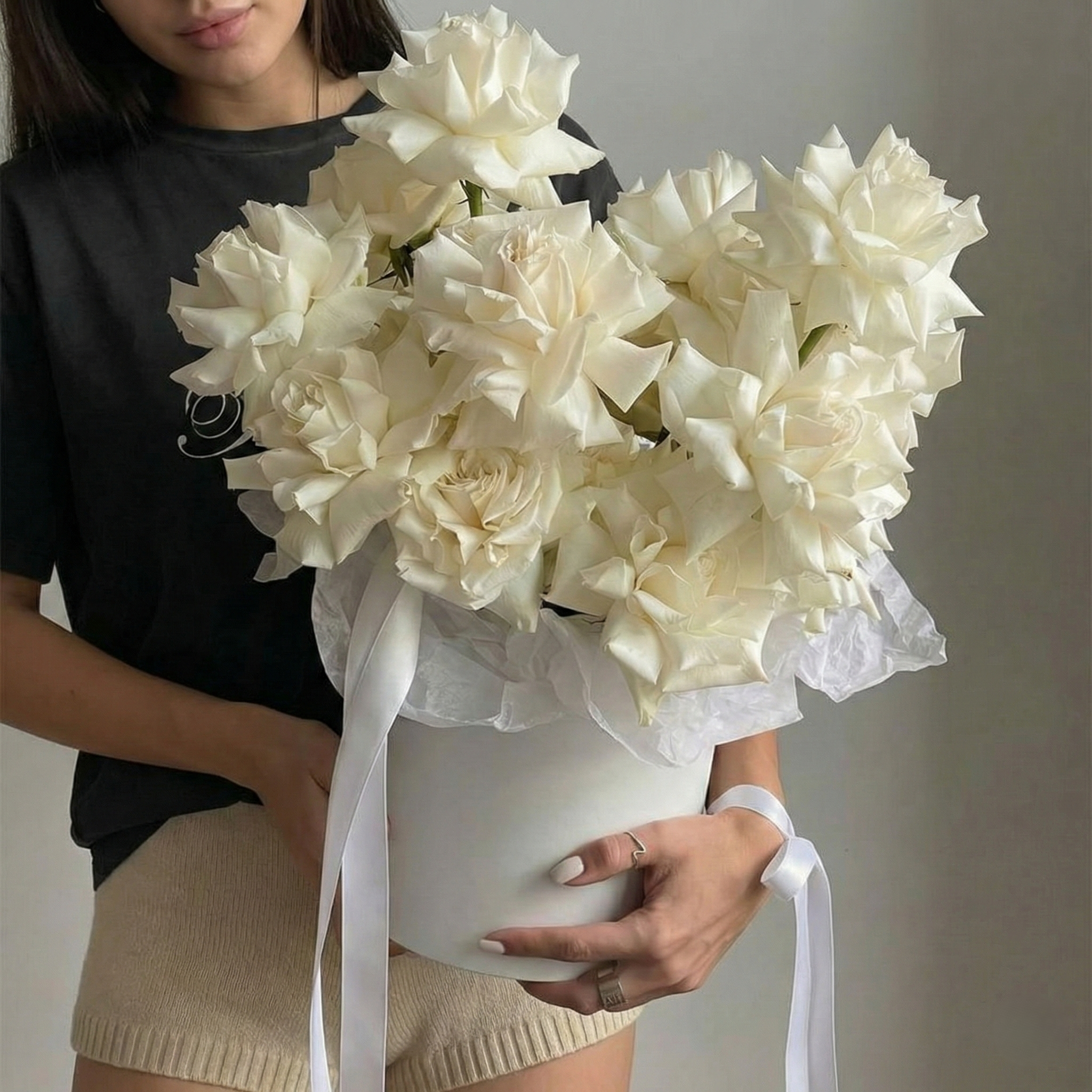 Безупречная элегантность в каждом лепестке. Пышные бутоны белых французских роз с их характерным раскрытием создают облако нежности и чистоты. Монохромное исполнение — белые цветы в белой шляпной коробке с ниспадающими атласными лентами — подчеркивает статусность и утонченный вкус дарителя. Эта композиция станет идеальным признанием в искренних чувствах или изысканным комплиментом.