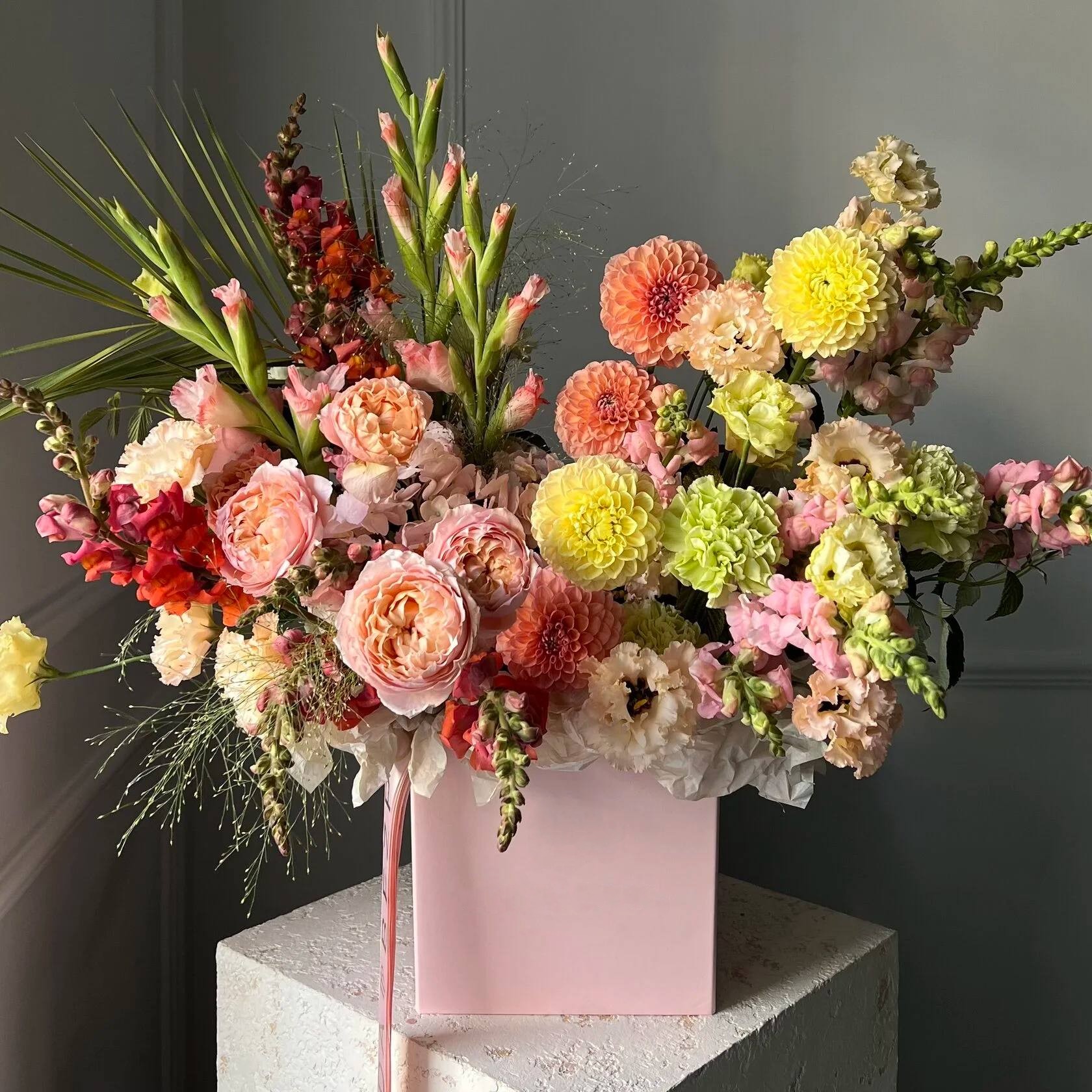 Этот букет — это картина позднего лета, написанная самыми сочными и теплыми красками. Я создавала его, вдохновляясь палитрой заходящего солнца. Высокие гладиолусы и антирринумы тянутся вверх, словно последние теплые лучи. Яркие, солнечные шары георгин — это сердце композиции, ее самое теплое воспоминание о лете.