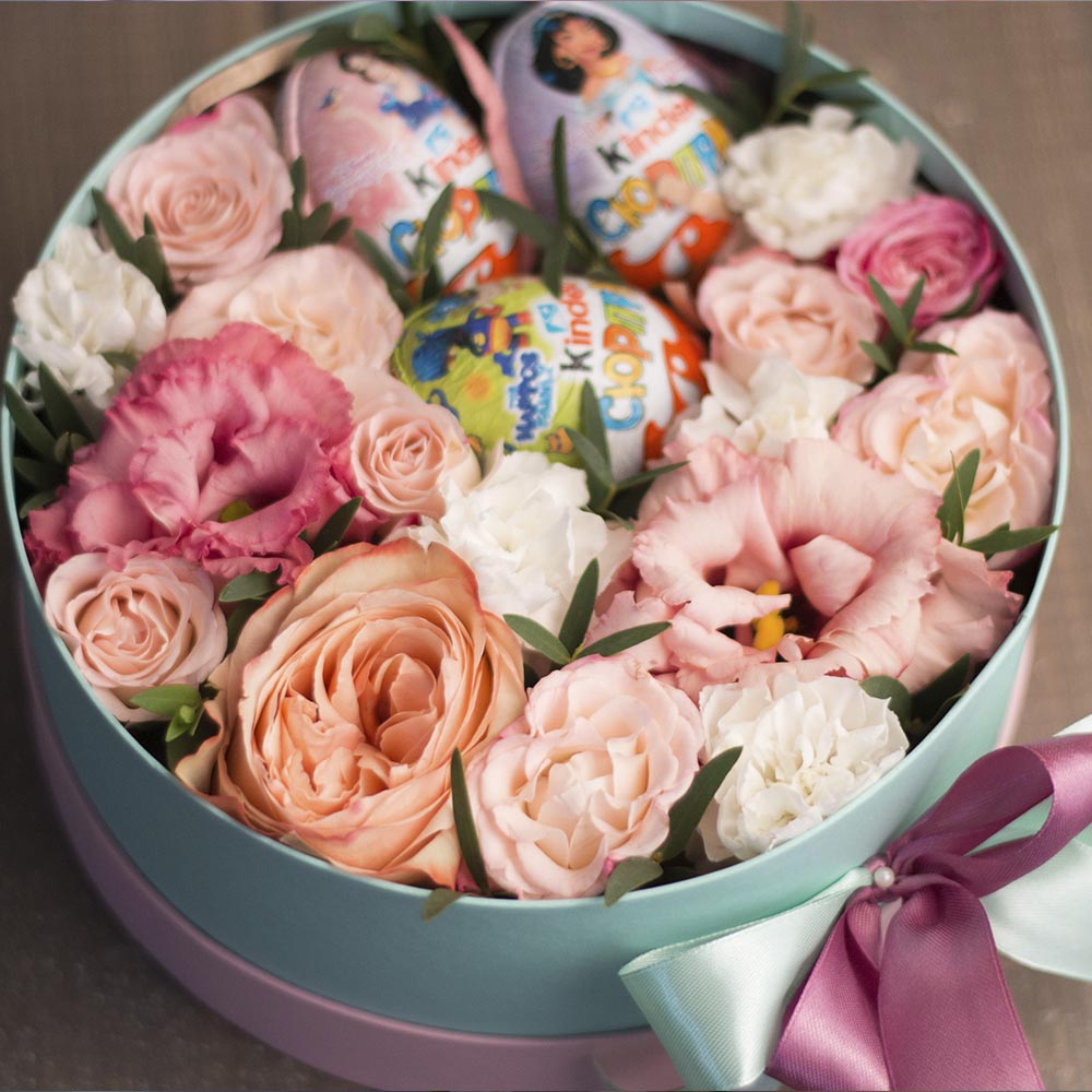 Цветы в круглой коробке с киндерамиЦветы в круглой коробке с киндерами