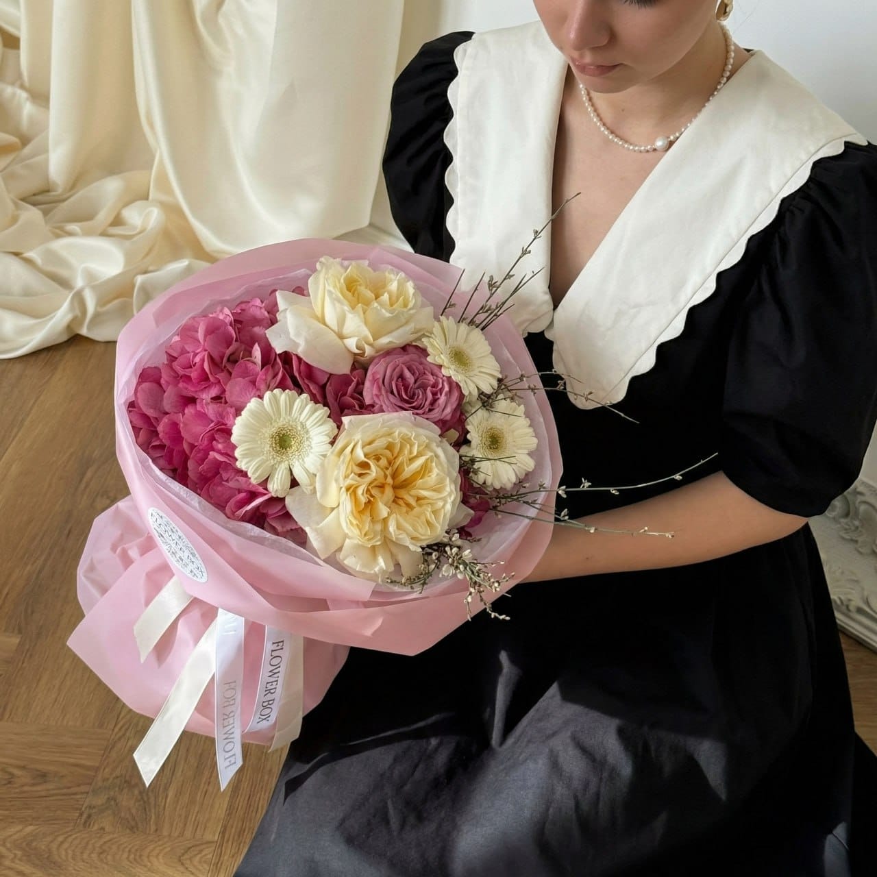 Игривая и романтичная композиция, сочетающая в себе яркие акценты и кремовую нежность. Центром притяжения выступает пышная розовая гортензия, насыщенный цвет которой мягко оттеняют крупные сливочные бутоны пионовидных роз. Миниатюрные гермини добавляют букету легкости и непосредственности, а изящные веточки дженисты создают воздушную текстуру и динамику. Все это великолепие оформлено в нежно-розовую упаковку, создавая образ утренней свежести и девичьих грез.