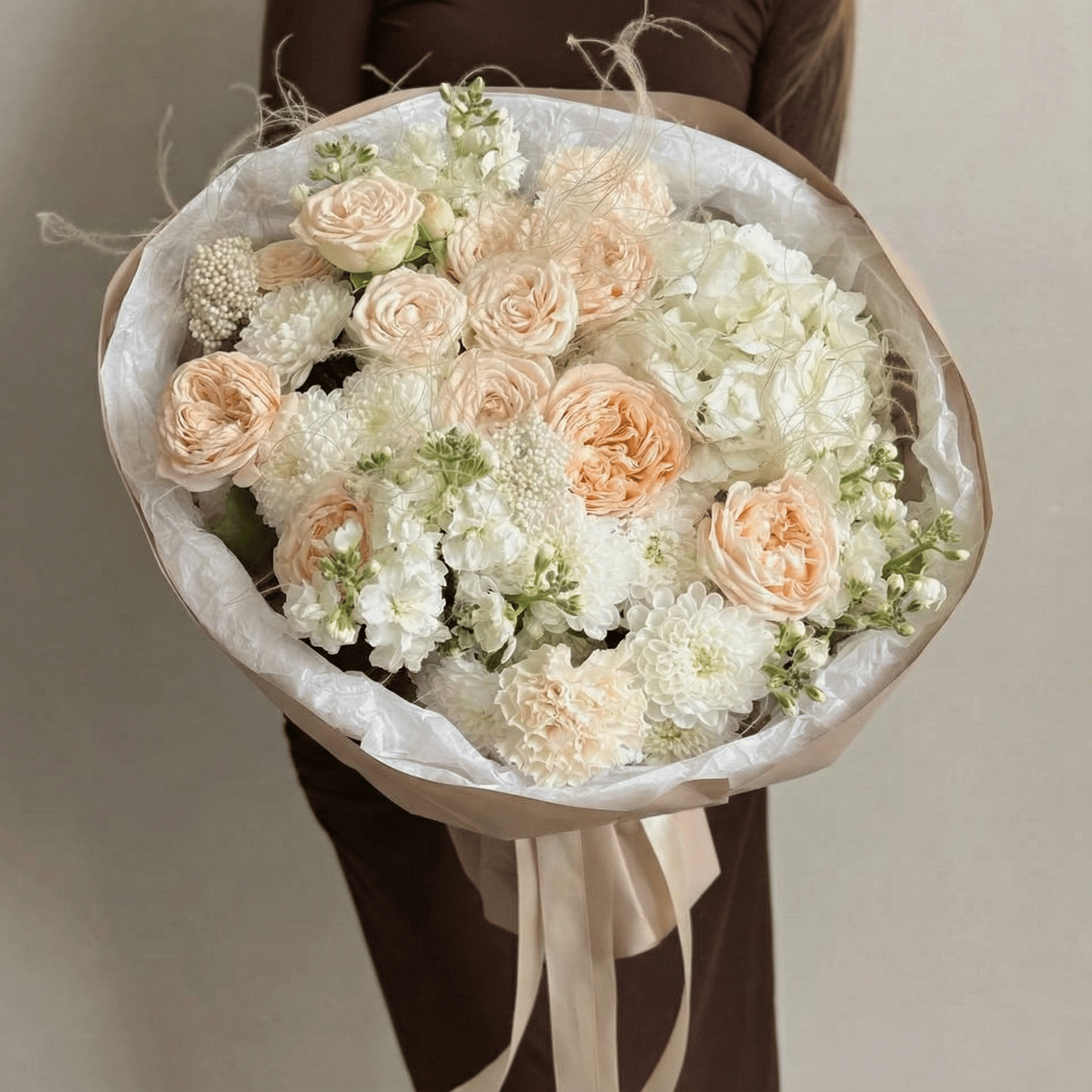 Этот букет - это само дыхание утренней свежести и романтики. Я собрала в нем самые нежные и фактурные цветы. Пышная белая гортензия и ароматная маттиола создают воздушную основу. Пионовидные розы и диантусы добавляют теплые, розовые акценты. А "рисовые" зернышки озотамнуса и невесомая стифа придают букету легкость и особый шарм.