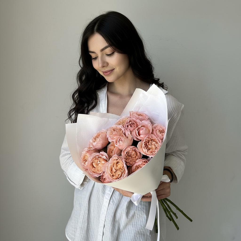 Этот букет - это маленький шедевр, воплощение нежности и аромата легендарной розы 'Джульетта'. Пять пышных веток создают компактное, но очень выразительное облако из персиково-розовых бутонов. Каждый цветок - это произведение искусства с множеством лепестков и тонким ароматом. Я выбрала простую светлую упаковку, чтобы ничего не отвлекало от красоты этих роз Дэвида Остина.