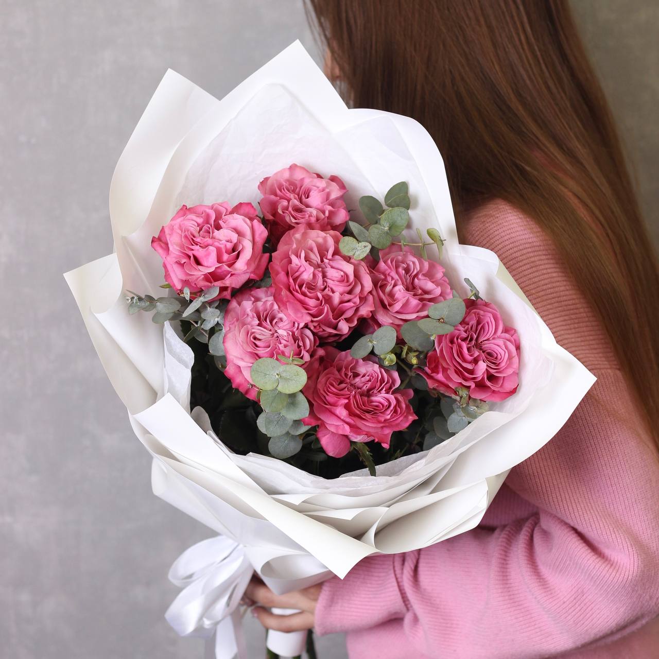 Этот букет - это сама нежность и ностальгия, воплощенные в винтажном оттенке роз. Семь пышных пионовидных роз сложного, пыльно-розового цвета - сердце этой композиции. Их аромат и многослойные бутоны создают ощущение романтики и уюта. Я добавила лишь несколько веточек серебристого эвкалипта, чтобы подчеркнуть их благородный оттенок и придать букету свежести.