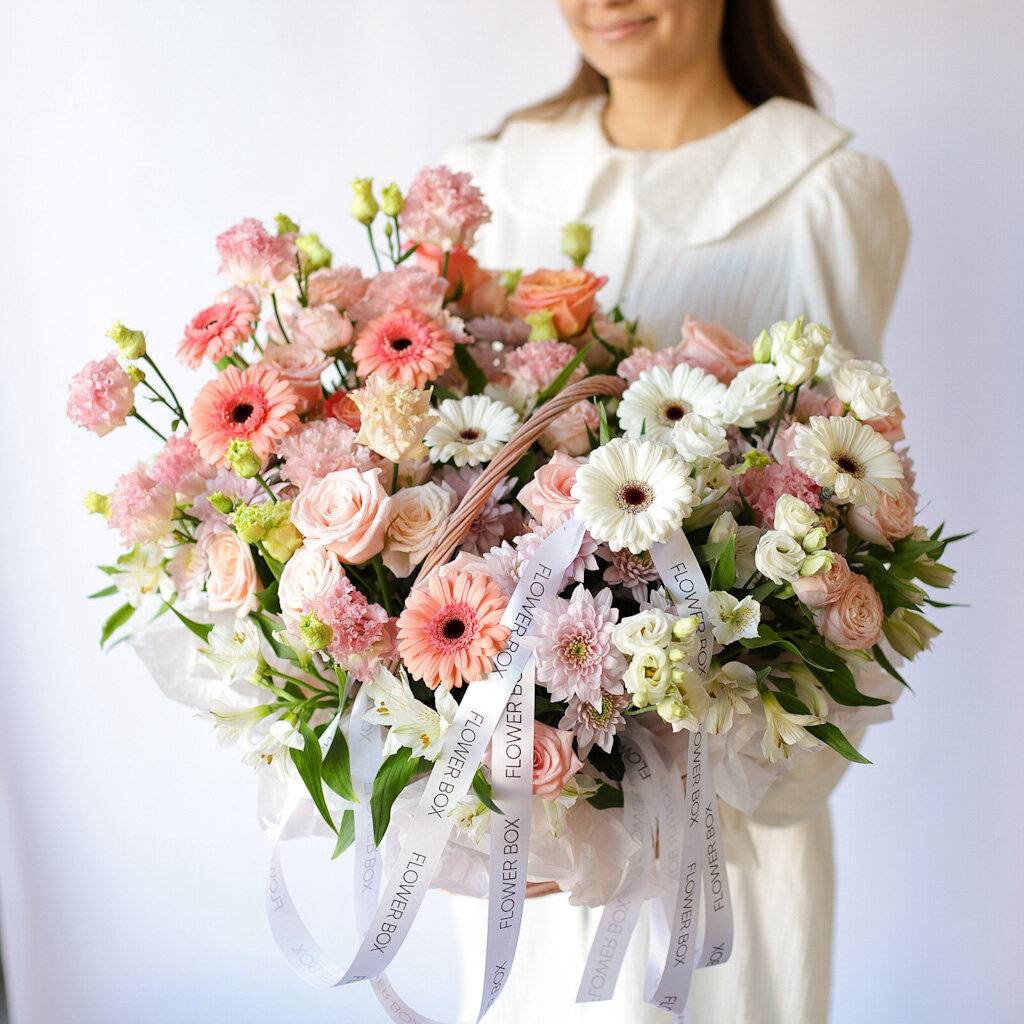 Теплая, персиково-розовая палитра дарит ощущение уюта и солнечного дня. Это идеальный подарок для большого торжества: дня рождения, юбилея или как знак особой благодарности. Композиция в корзине не требует вазы и будет долго радовать своей свежестью, напоминая о счастливом моменте.