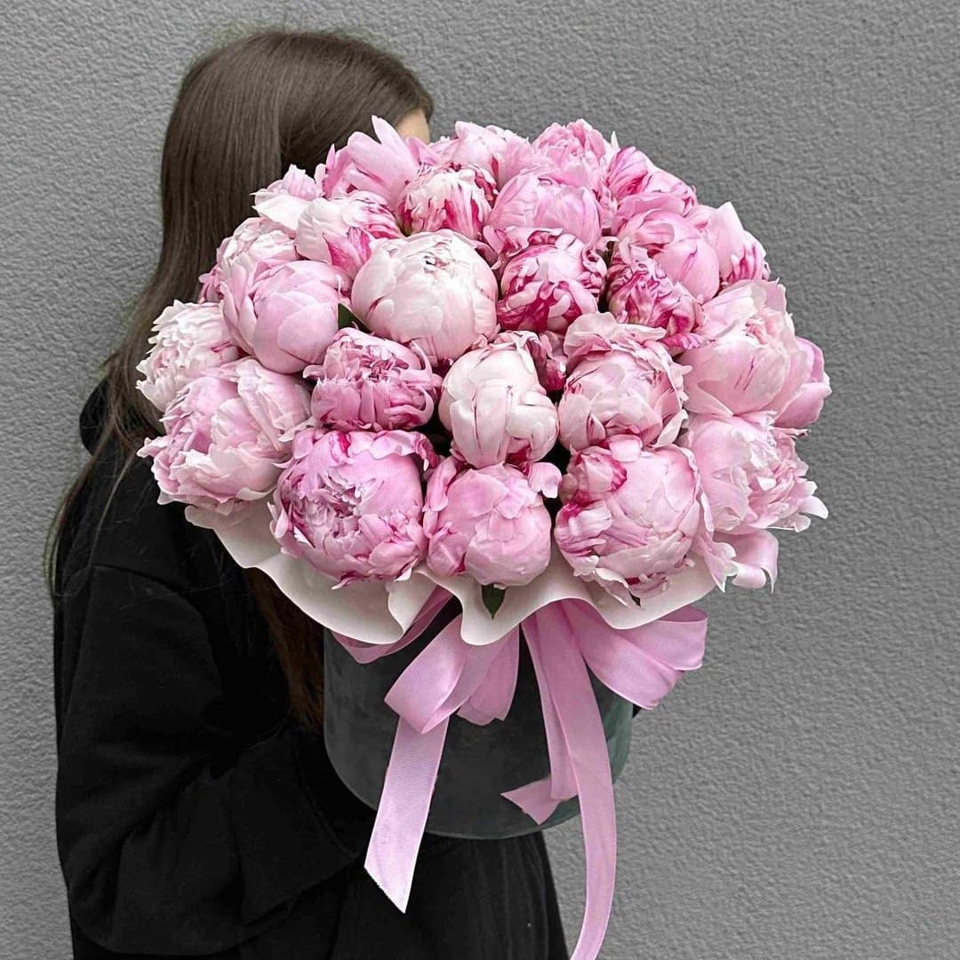 Эта шляпная коробка — настоящая сокровищница, доверху наполненная самыми нежными цветами. Я создала эту композицию как воплощение роскоши и щедрости. Тридцать один пышный пион, словно драгоценные розовые жемчужины, уложены в ней плотно друг к другу, формируя огромное ароматное облако.