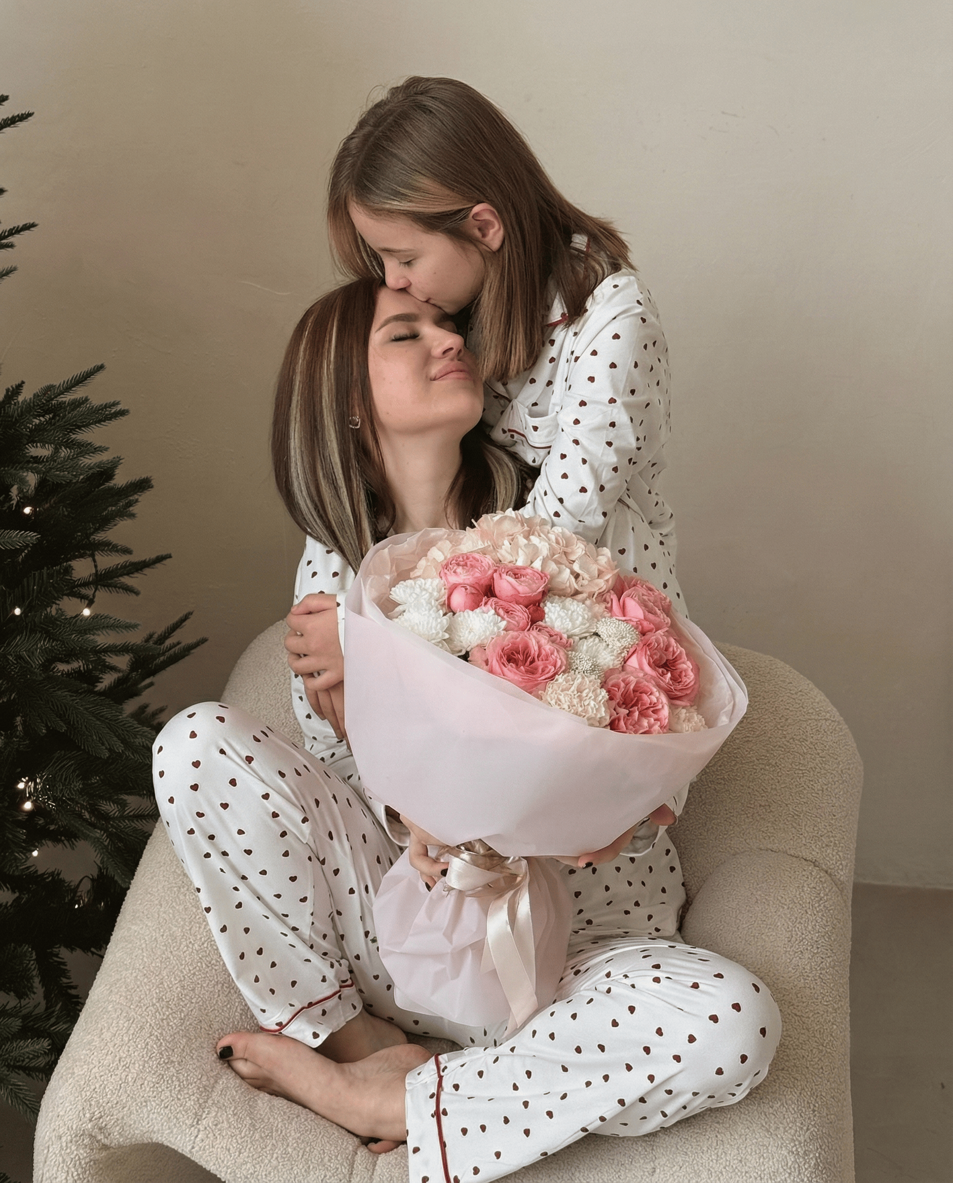 Этот букет - это сложная и увлекательная игра фактур в нежных тонах. Я создала его как произведение искусства, которое хочется долго рассматривать. В основе - воздушная гортензия, которую окружают роскошные пионовидные розы разных размеров. Фактурные диантусы и пушистая хризантема Алтай добавляют объем, а мелкие, словно рисовые зернышки, соцветия озотамнуса придают композиции уникальную изюминку и современный вид.