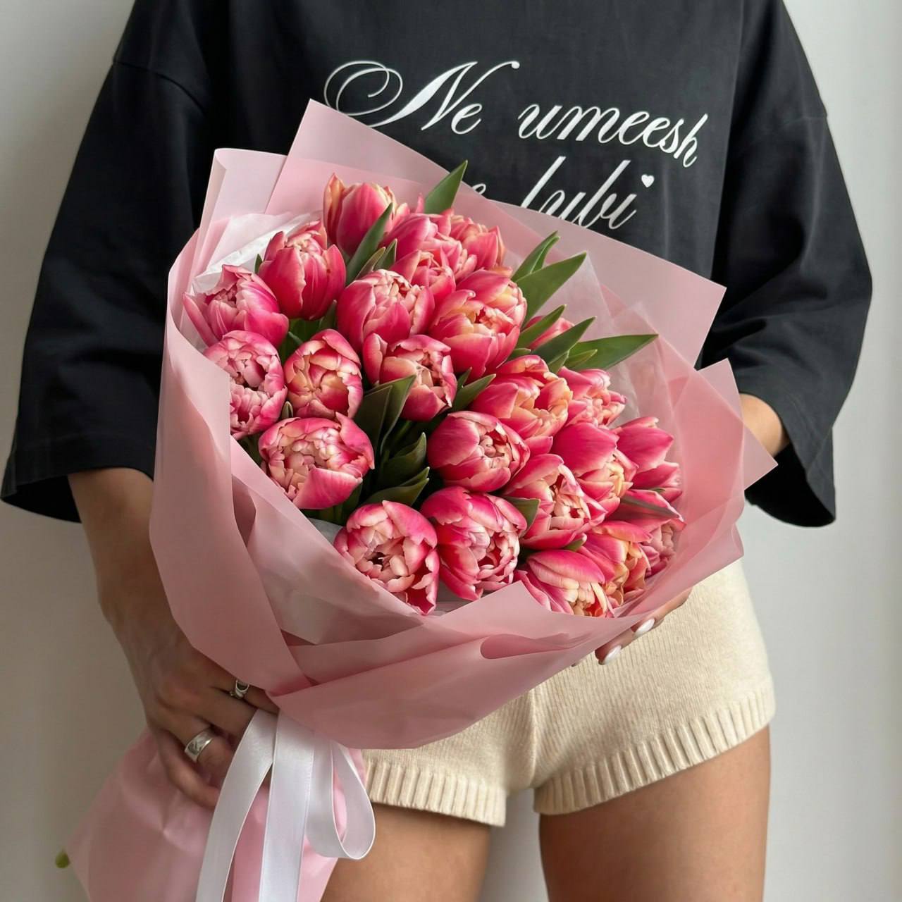 Этот впечатляющий букет из 21 пионовидного тюльпана сорта Columbus — настоящий взрыв цвета и весенней энергии. Густомахровые бутоны с насыщенными малиново-розовыми лепестками и тонкой кремовой каймой раскрываются подобно пышным пионам, создавая богатую фактуру. Объемная композиция выглядит торжественно и празднично. Оформление в нежную розовую бумагу гармонично дополняет яркие цветы, подчеркивая их красоту и свежесть. Это идеальный подарок, чтобы выразить сильные чувства и подарить незабываемые эмоции.